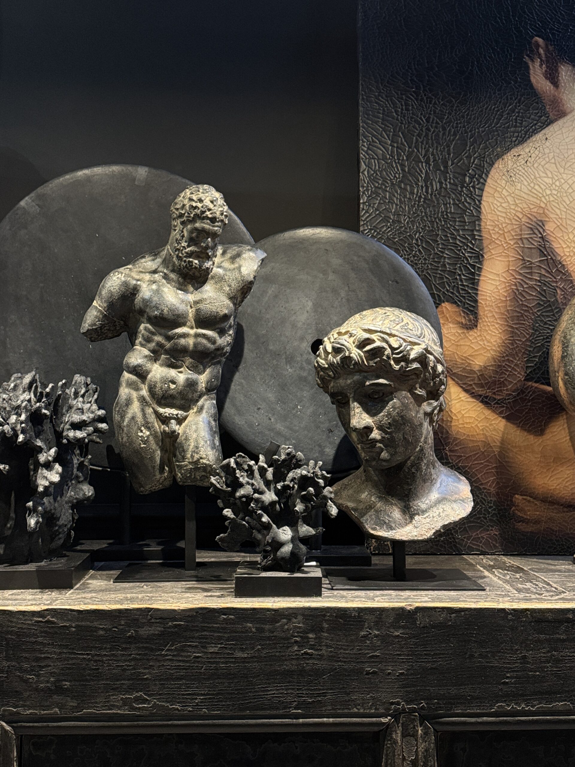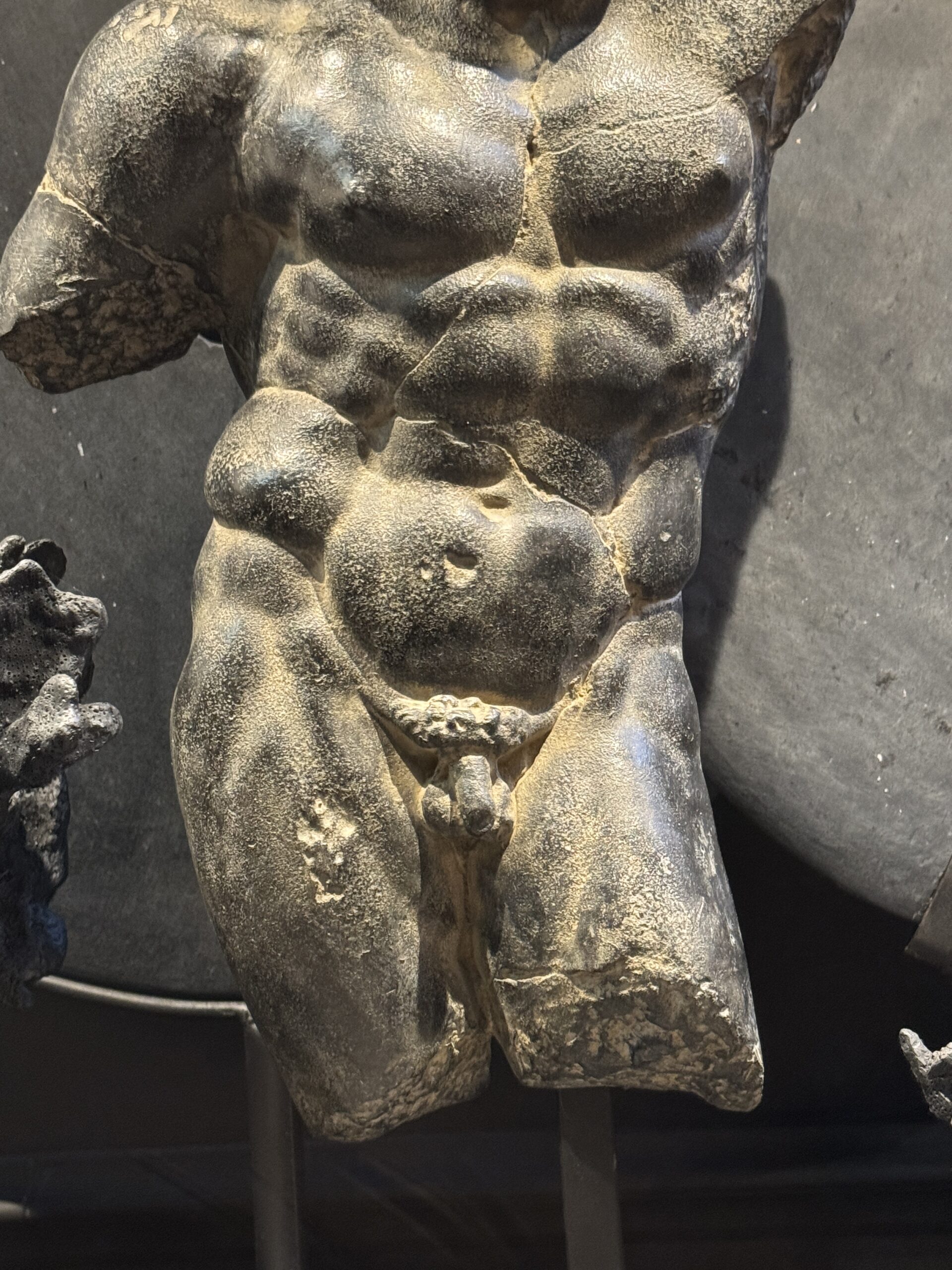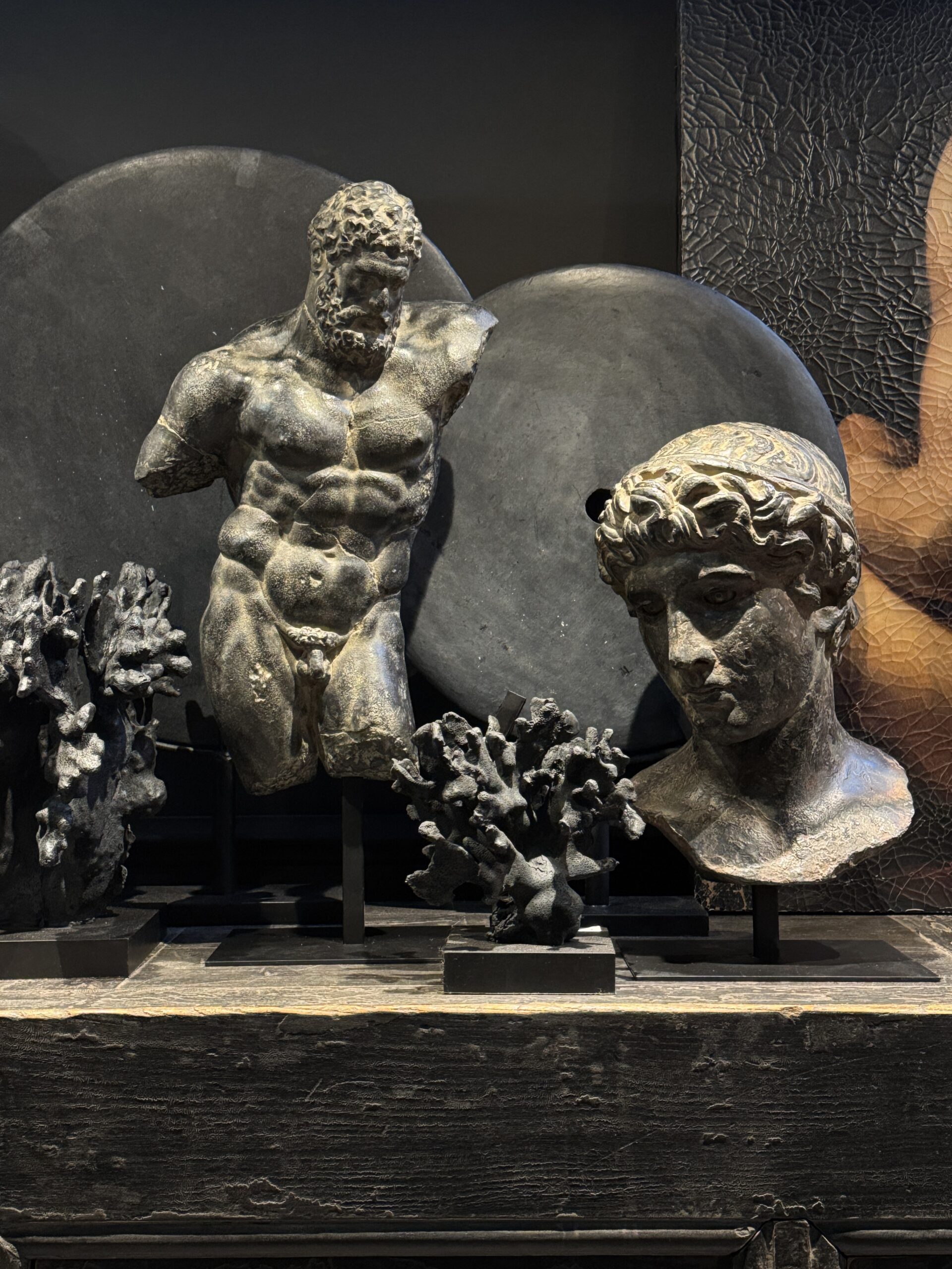 Reproductie van een fragment van een Herculesbeeld uit het begin van de 3de eeuw, toegeschreven aan de beeldhouwer Glycon uit Athene. Het stelt de Griekse held voor die net de 11e van de "12 werken van Hercules" heeft volbracht: het stelen van gouden appels uit de tuin van de Hesperiden na het doden van de draak die ze bewaakte.