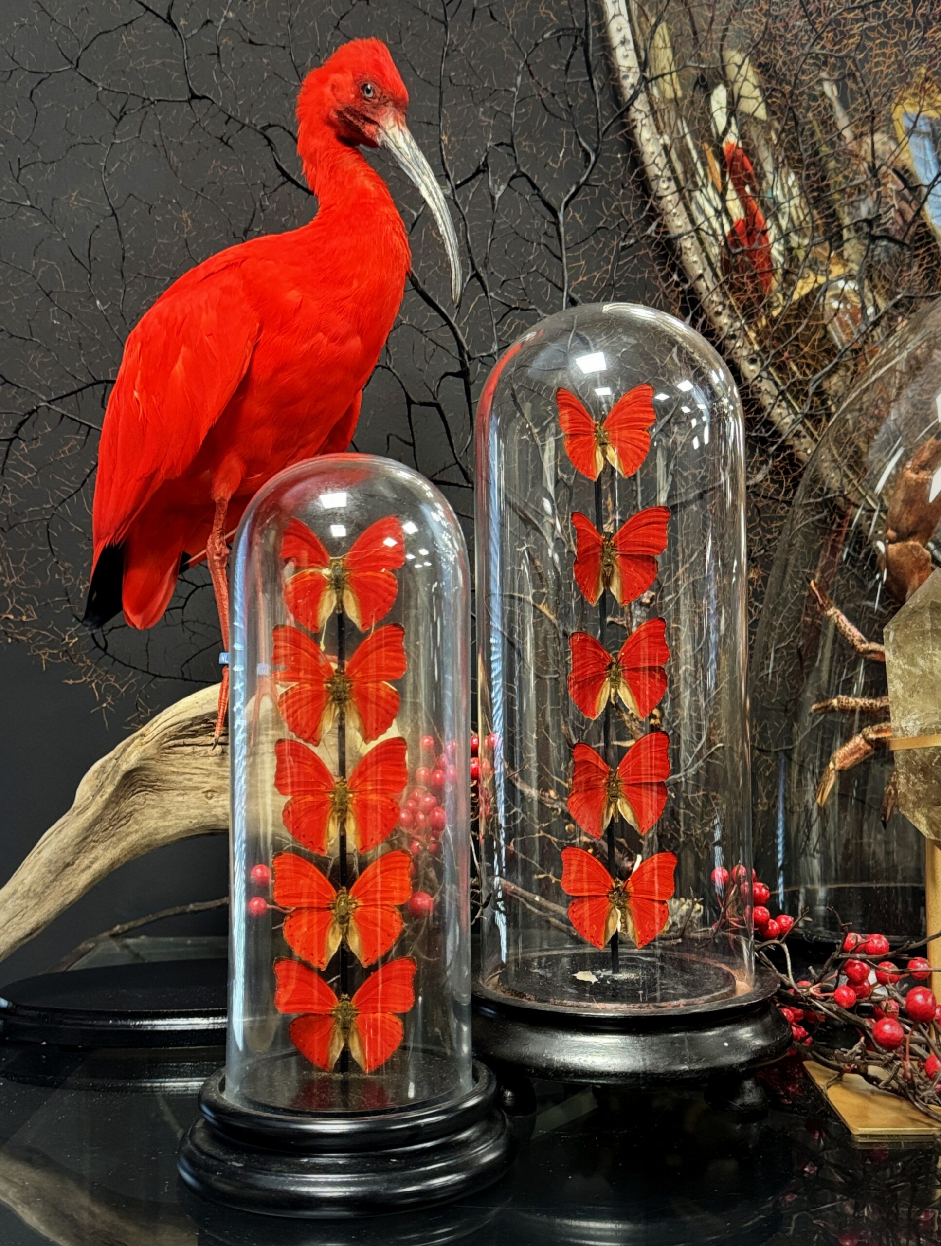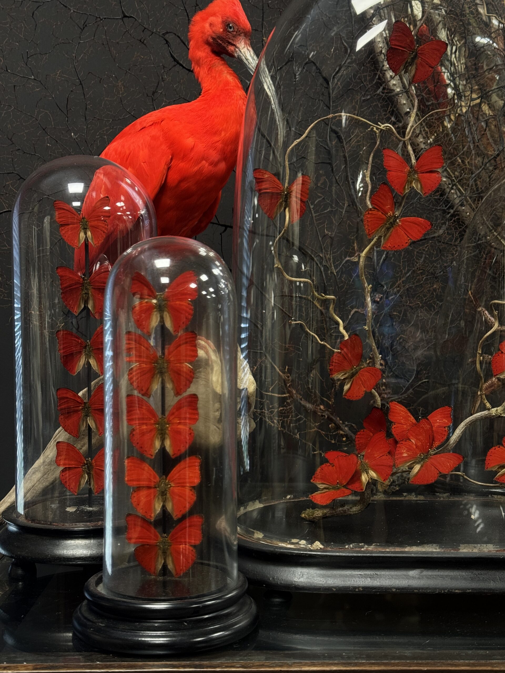 Antieke kleine Stolp met prachtige rode vlinders (Cymothoe Sangaris) gemonteerd op een natuurlijke tak. BEAST interiors kan stolpen in diverse vormen en met een vulling naar wens voor u maken. Informeer naar de mogelijkheden.