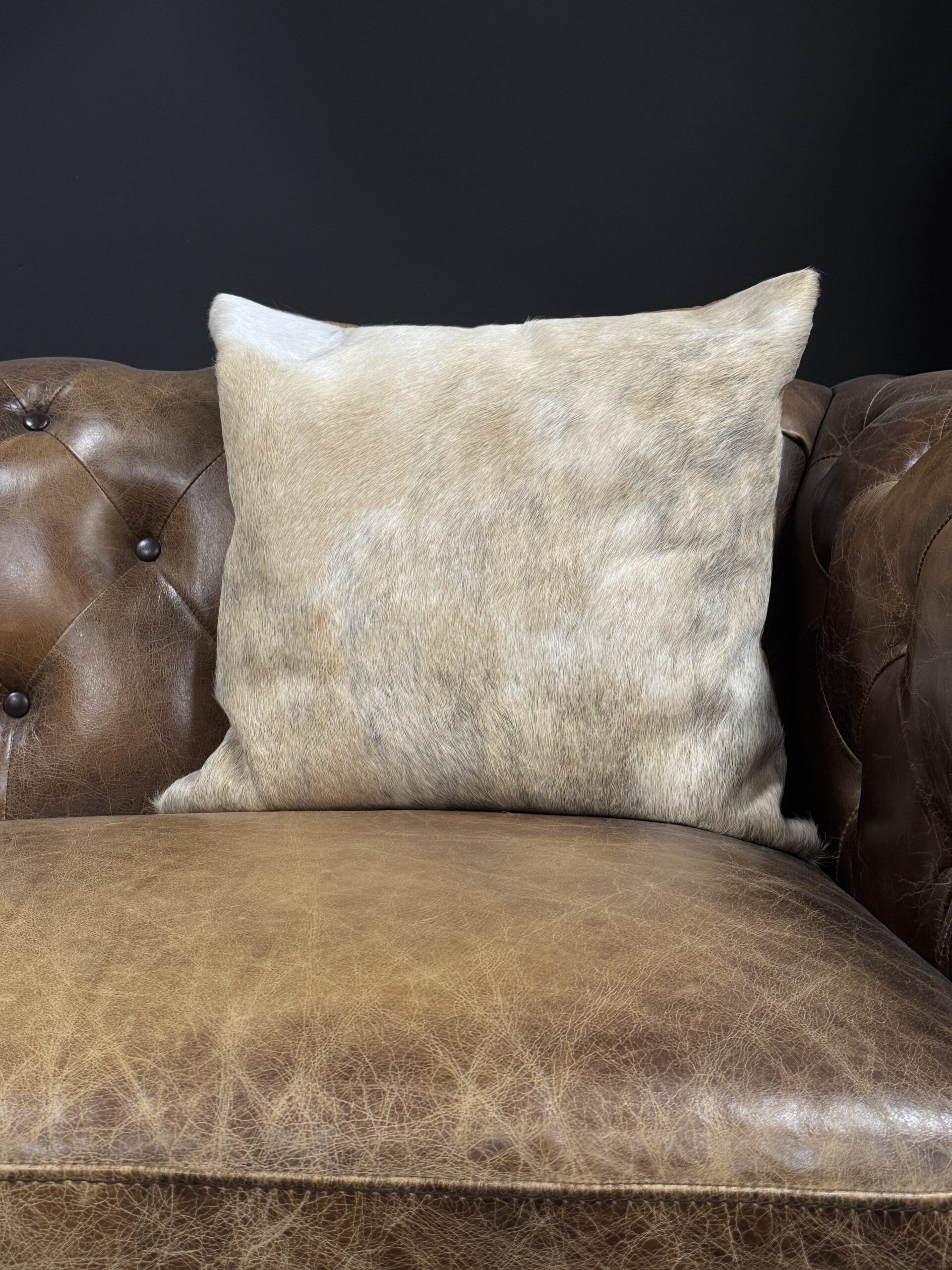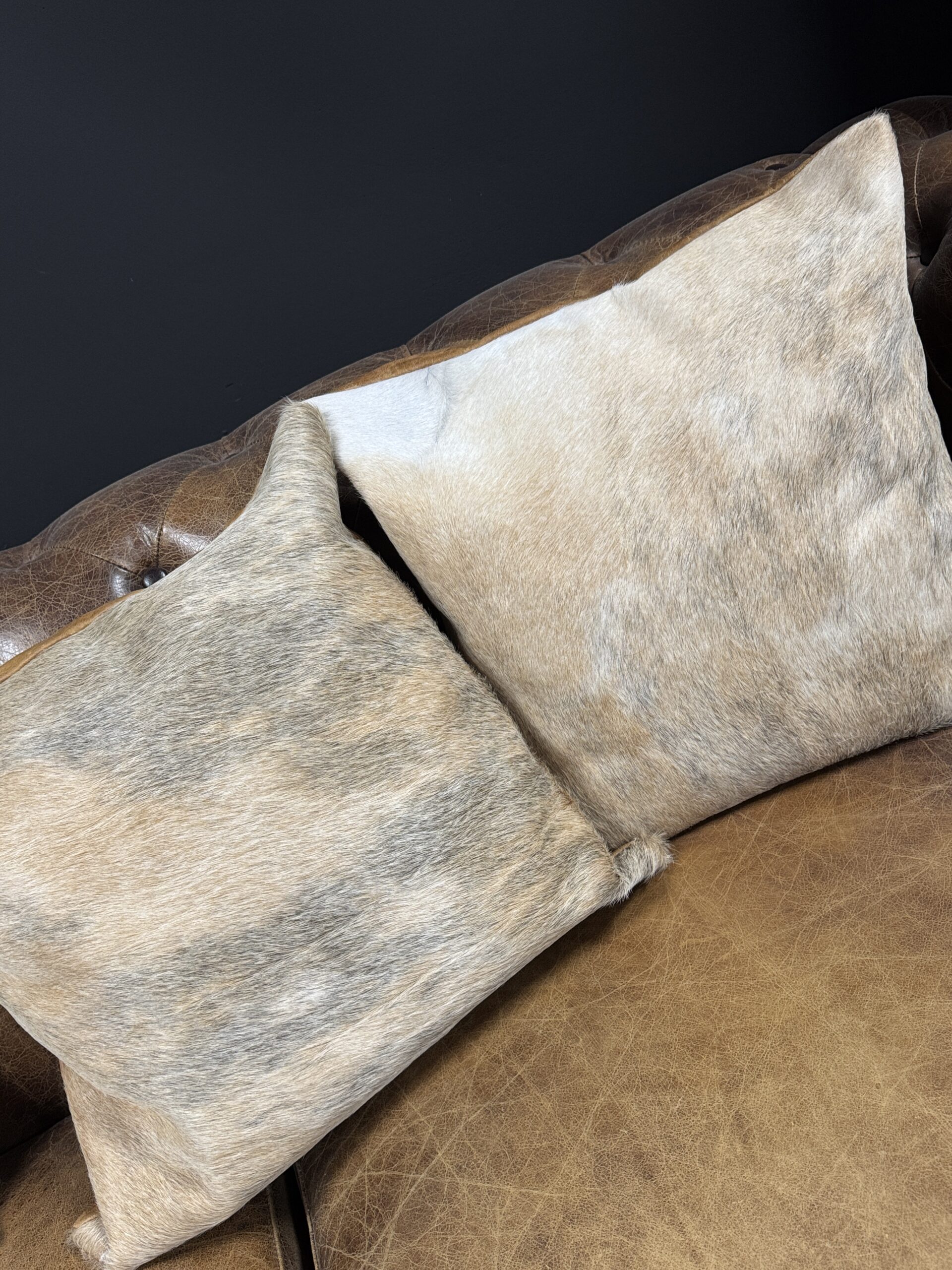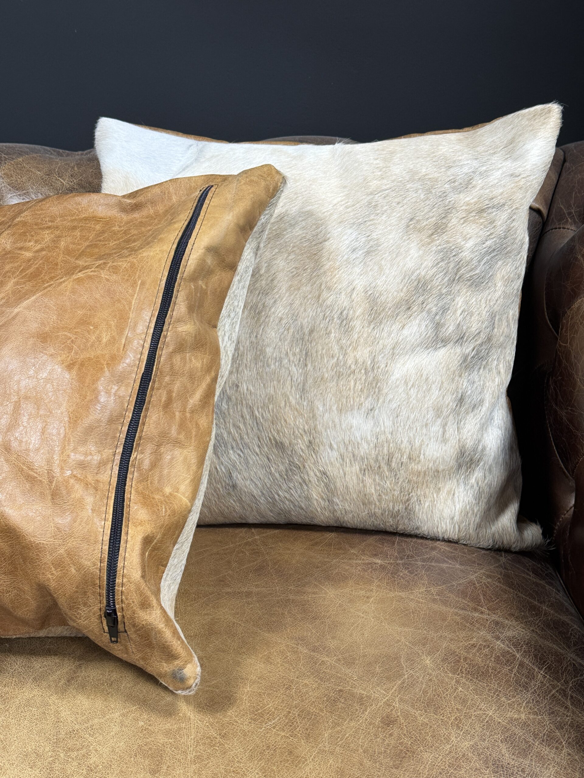 Set handgemaakte kussens van koehuid. Hoogwaardige kussens gemaakt van a-grade koehuiden. De kussens worden geleverd met vulling en hebben een rits aan de achterzijde.