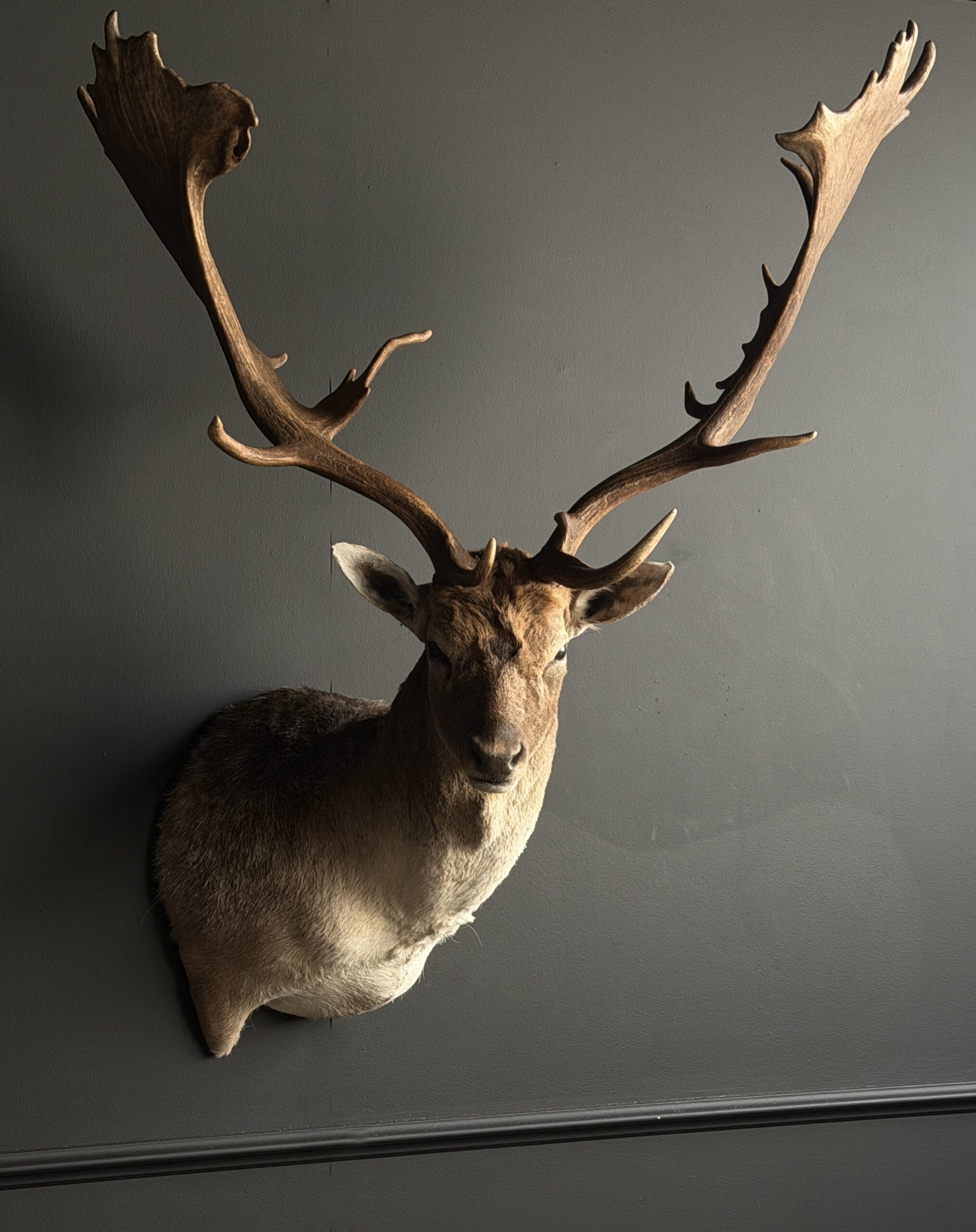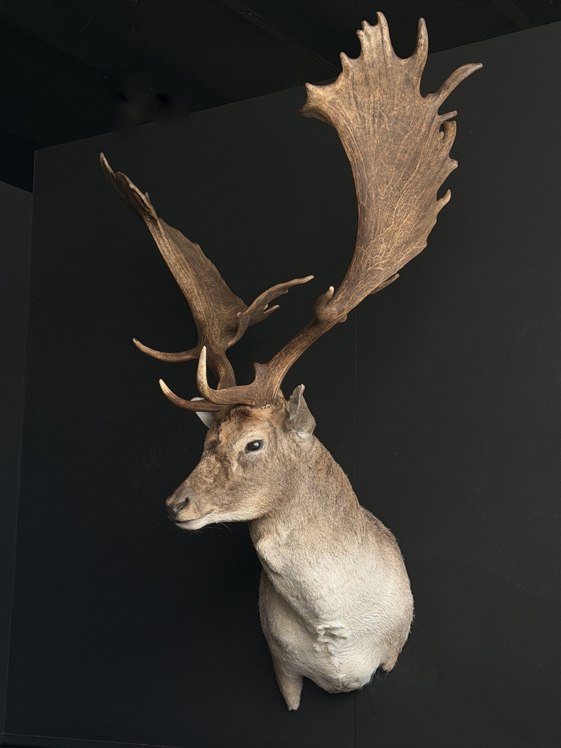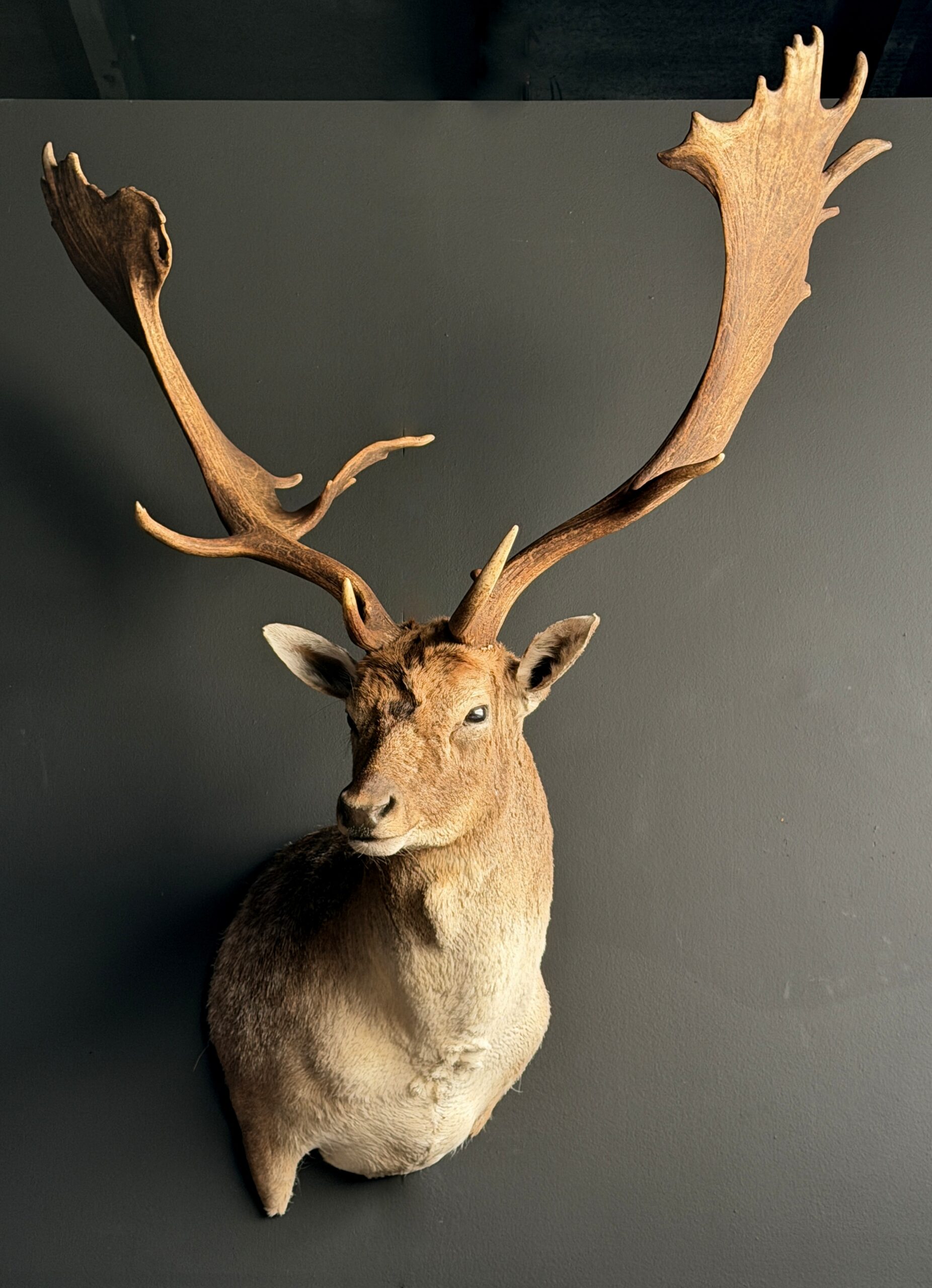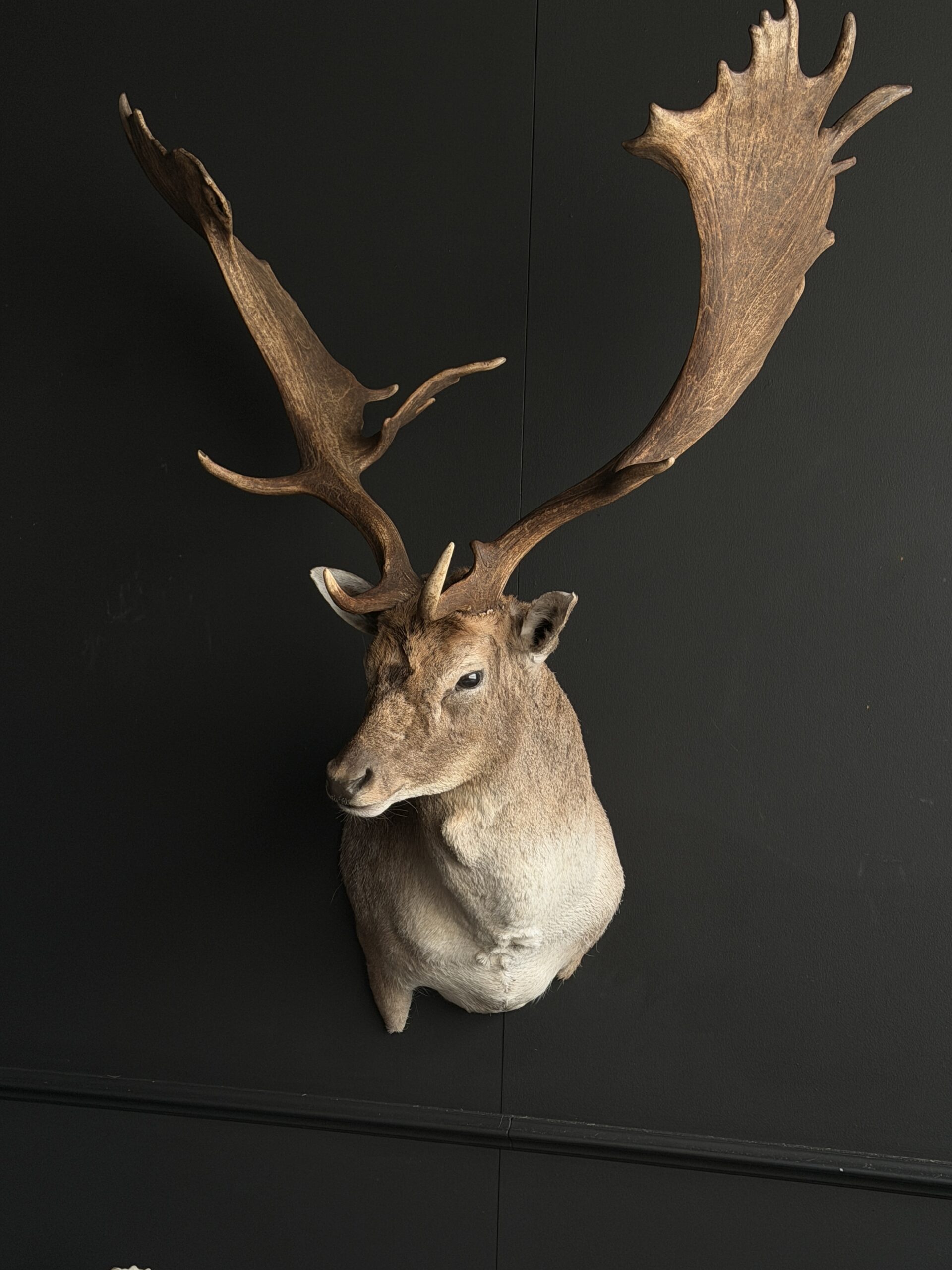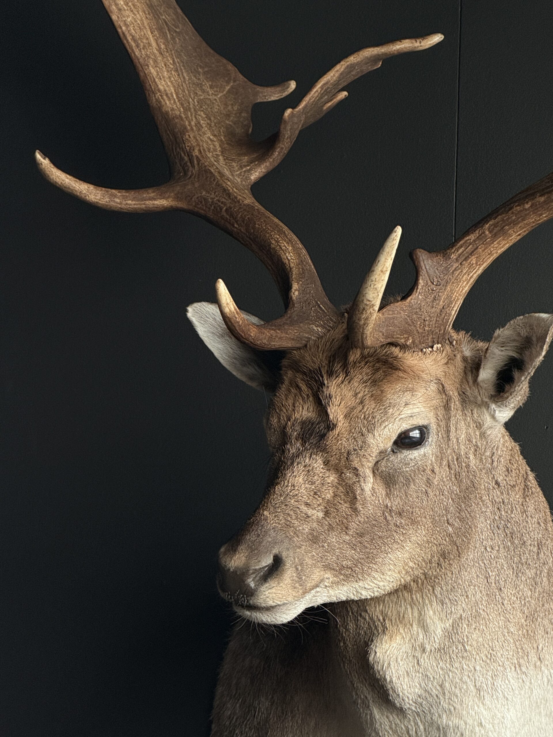 Nieuwe opgezette kop van een groot damhert. Dit prachtige damhert is opgezet in gedraaide pose waarbij het gewei mooi zichtbaar is. Het hert is opgezet met zeer veel oog voor detail wat het een prachtig stuk maakt.