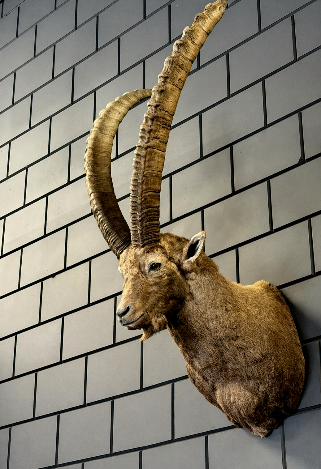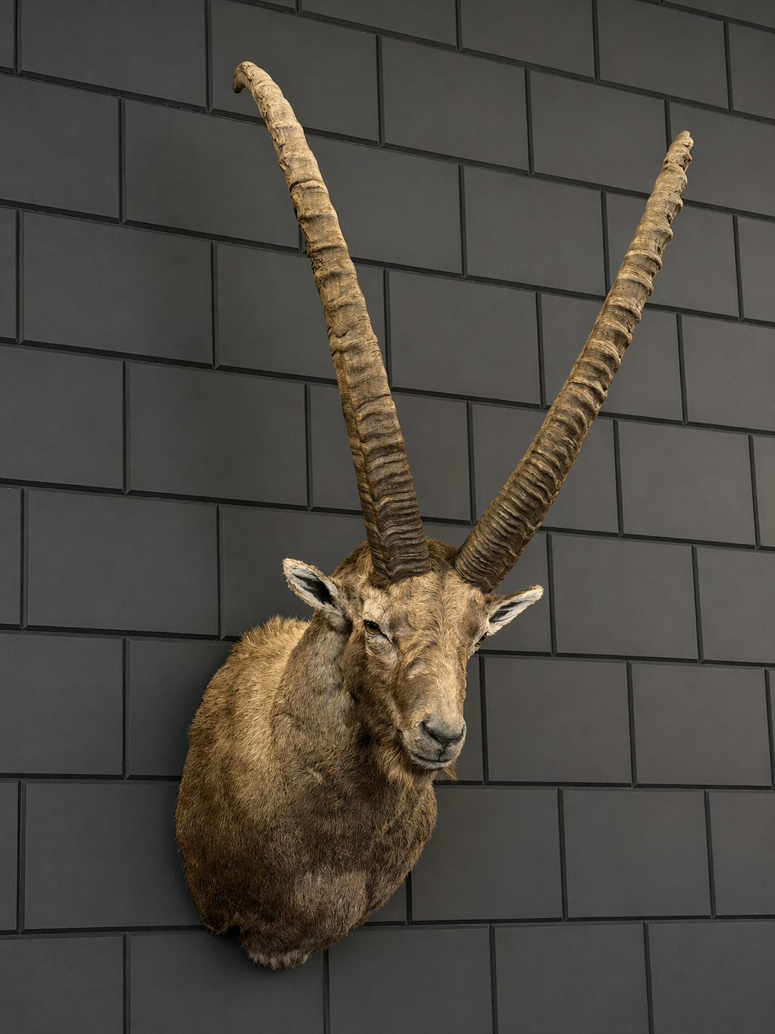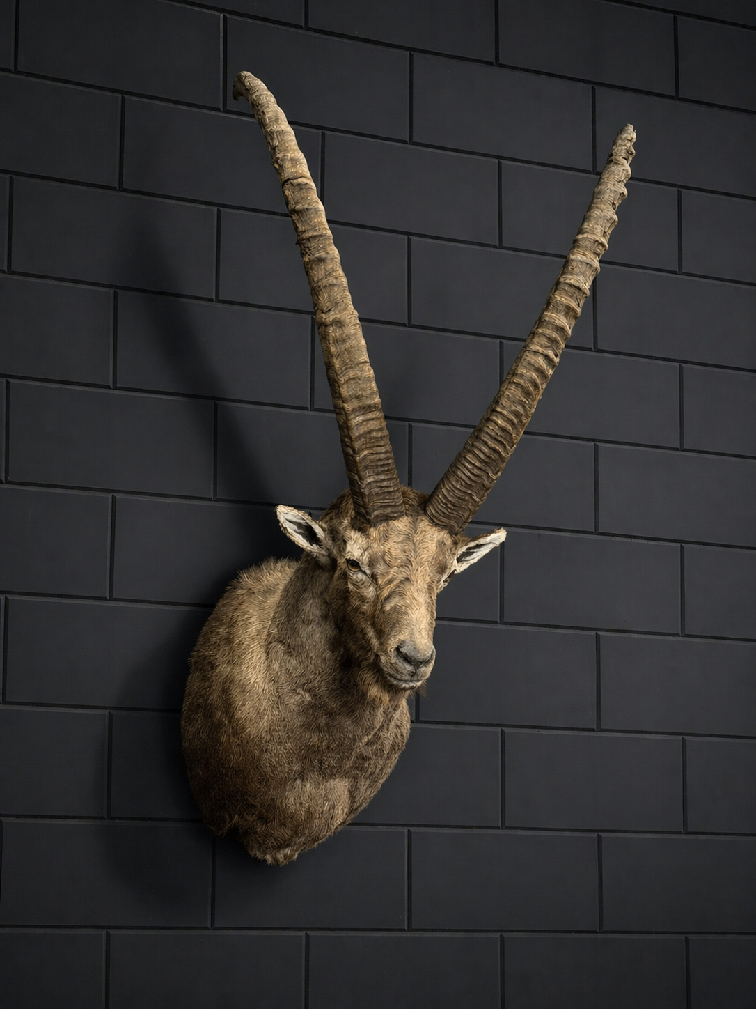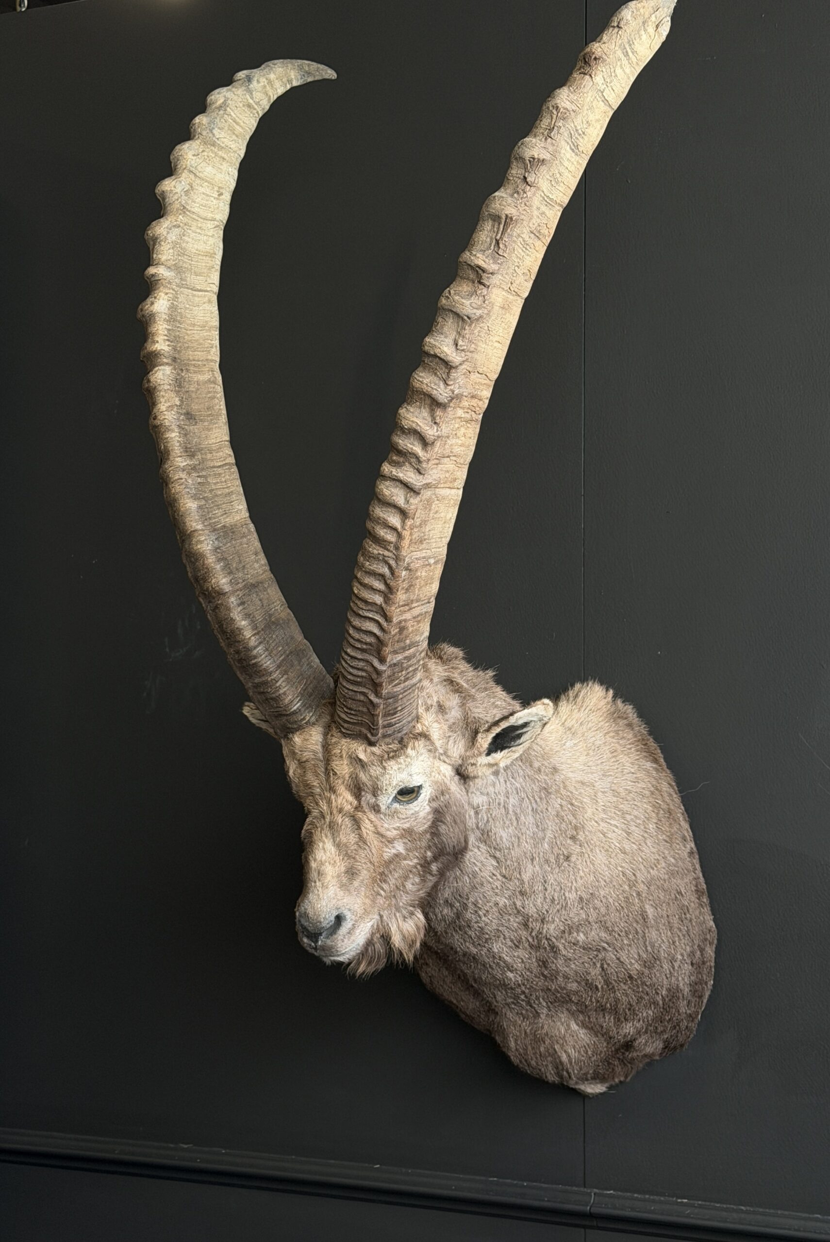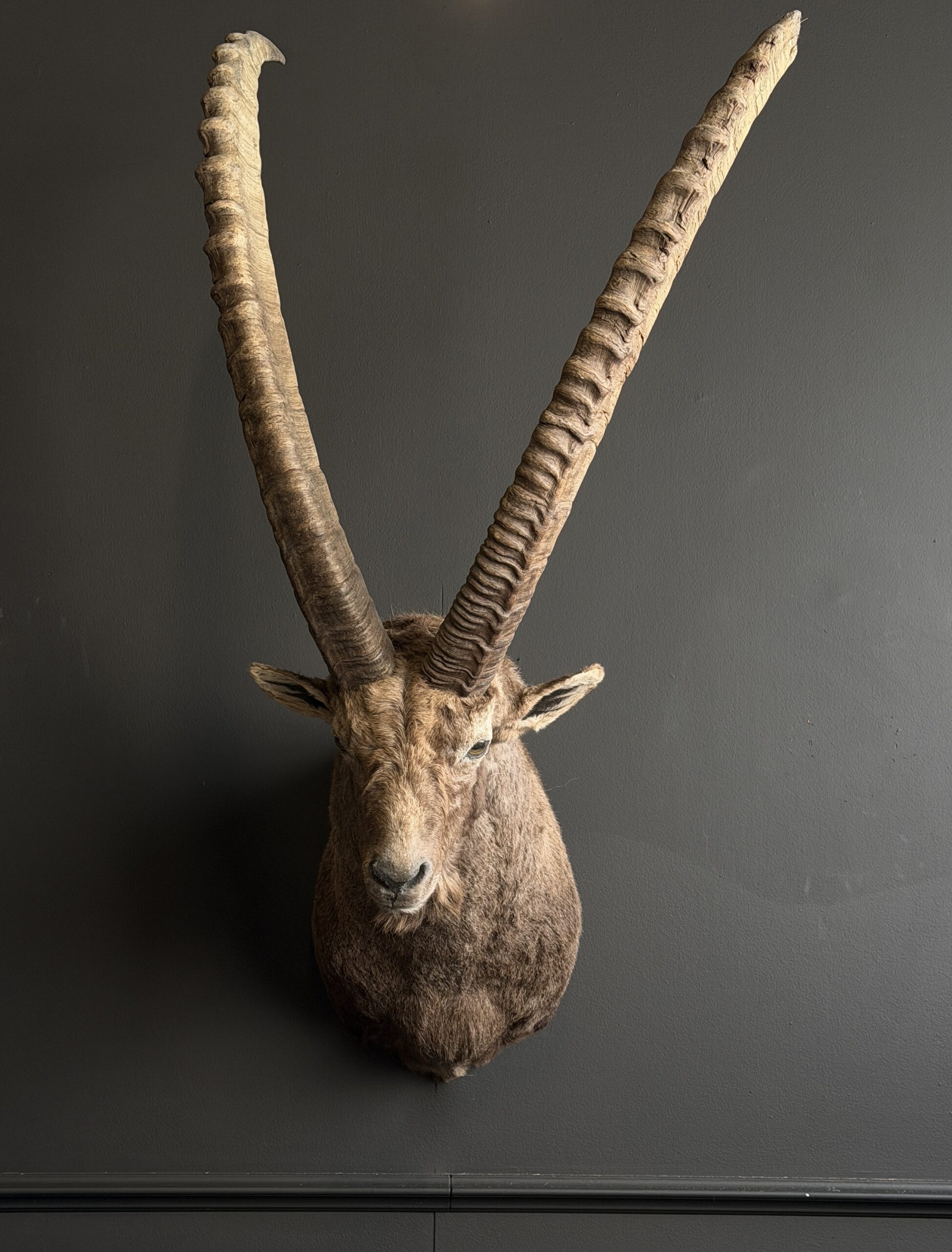 Een zeldzaam groot en oud exemplaar – deze indrukwekkende steenbokkop is met oog voor detail en vakmanschap geprepareerd. De krachtige bouw, lange gebogen hoorns en natuurgetrouwe expressie maken dit stuk tot een absolute blikvanger.