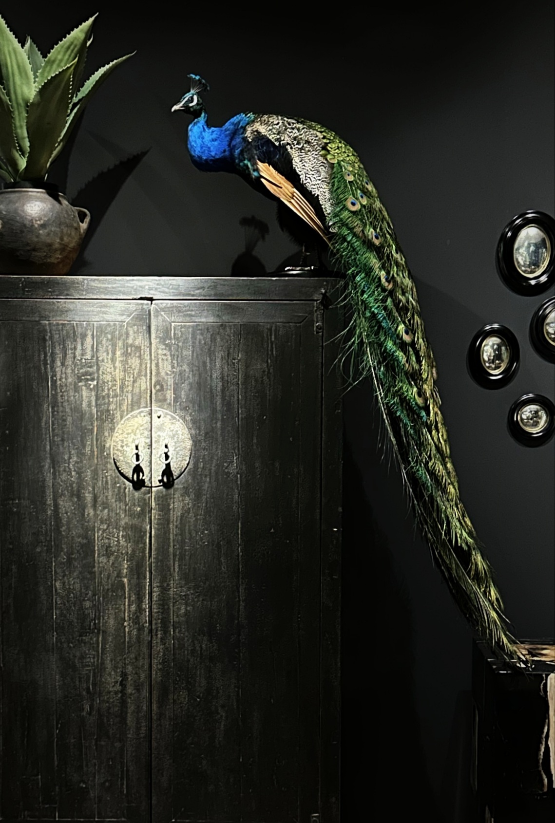 Majestueuze opgezette blauwe pauw - een tijdloos meesterwerk Met zijn levendige en iriserende verenkleed staat de pauw symbool voor vorstelijke elegantie en ongeëvenaarde gratie. Zijn zorgvuldig bewerkte veren vangen elk detail op en laten de iriserende tinten blauw, groen en goud zien die glinsteren in het licht. Dit adembenemende kunstwerk zal ongetwijfeld het middelpunt zijn van elke ruimte, of het nu een statig landhuis, een verfijnde galerie of een chique boetiek is. De opgezette pauw is gemaakt door een zeer vakkundige taxidermist en weerspiegelt het hoogste niveau van artisticiteit en aandacht voor detail. De delicate positionering van het verenkleed van de pauw, zijn koninklijke houding en de levensechte uitdrukking tonen het meesterschap van taxidermie als een vorm van kunst.