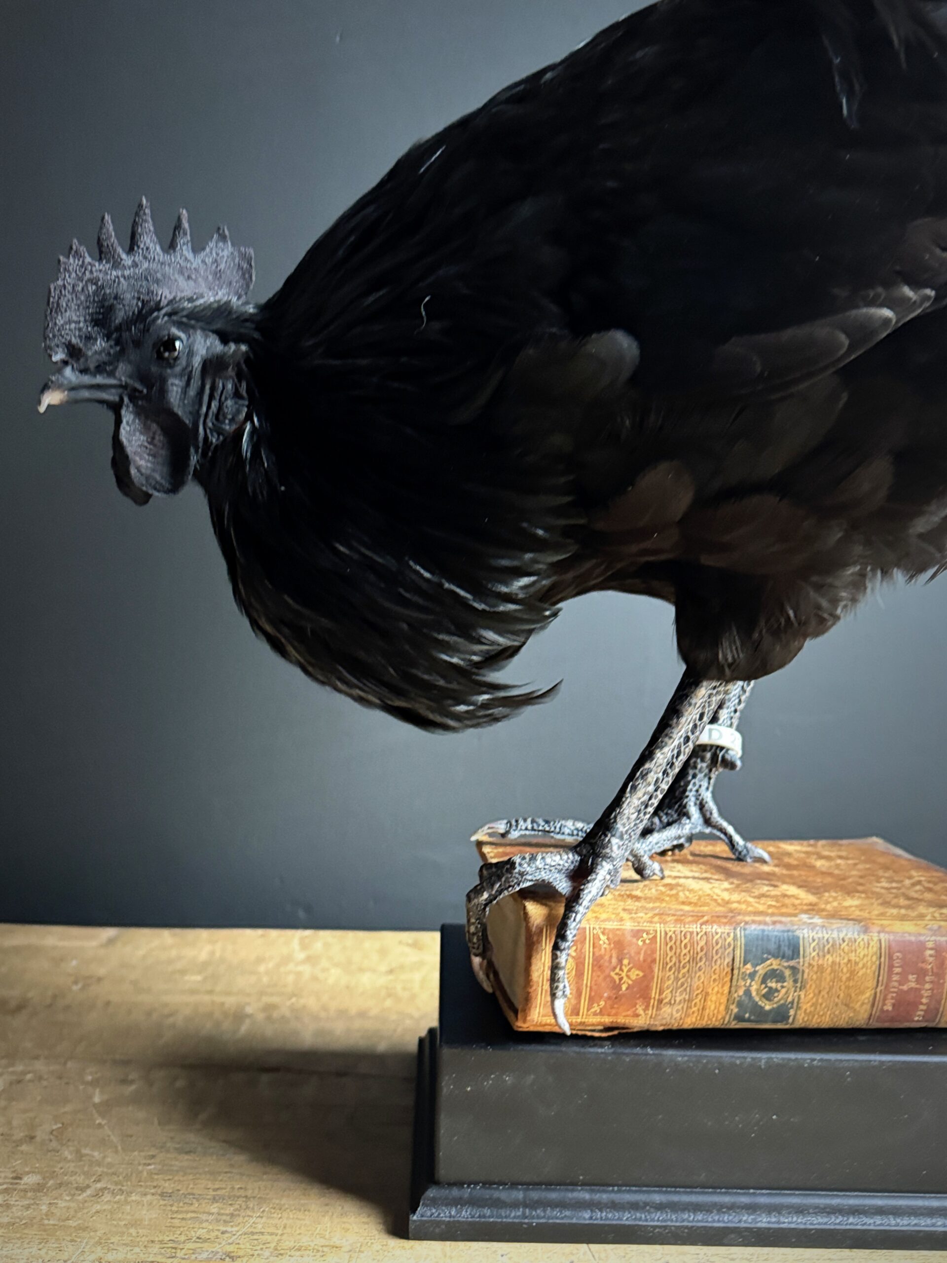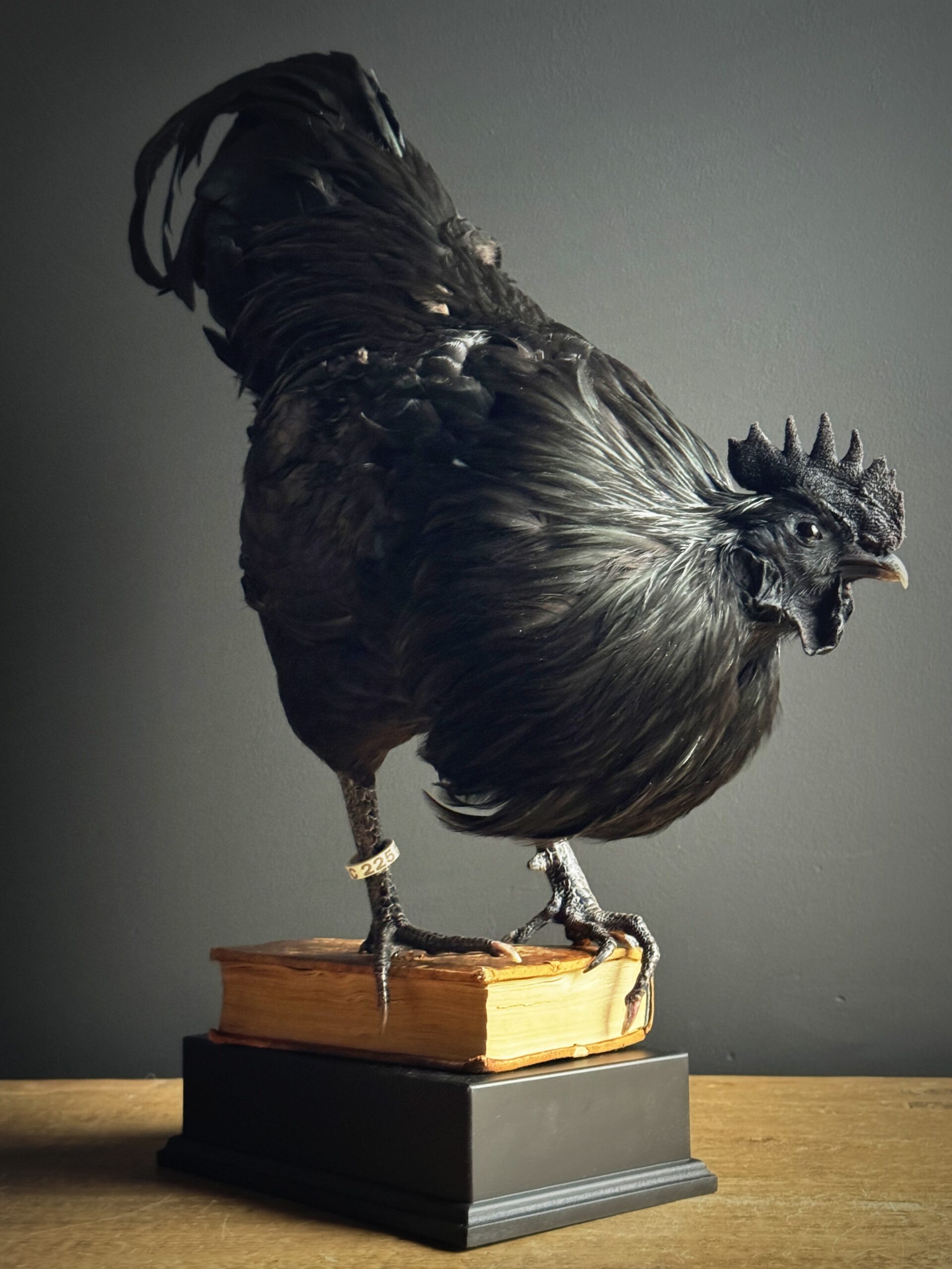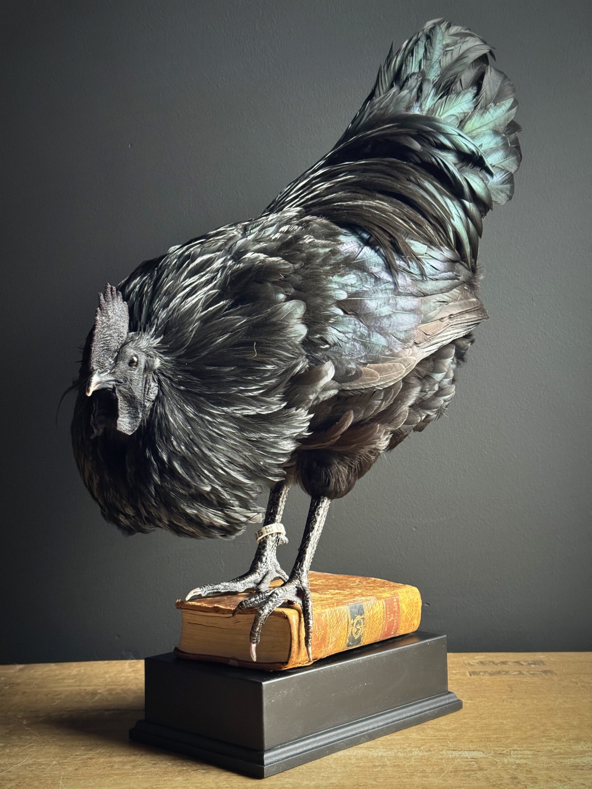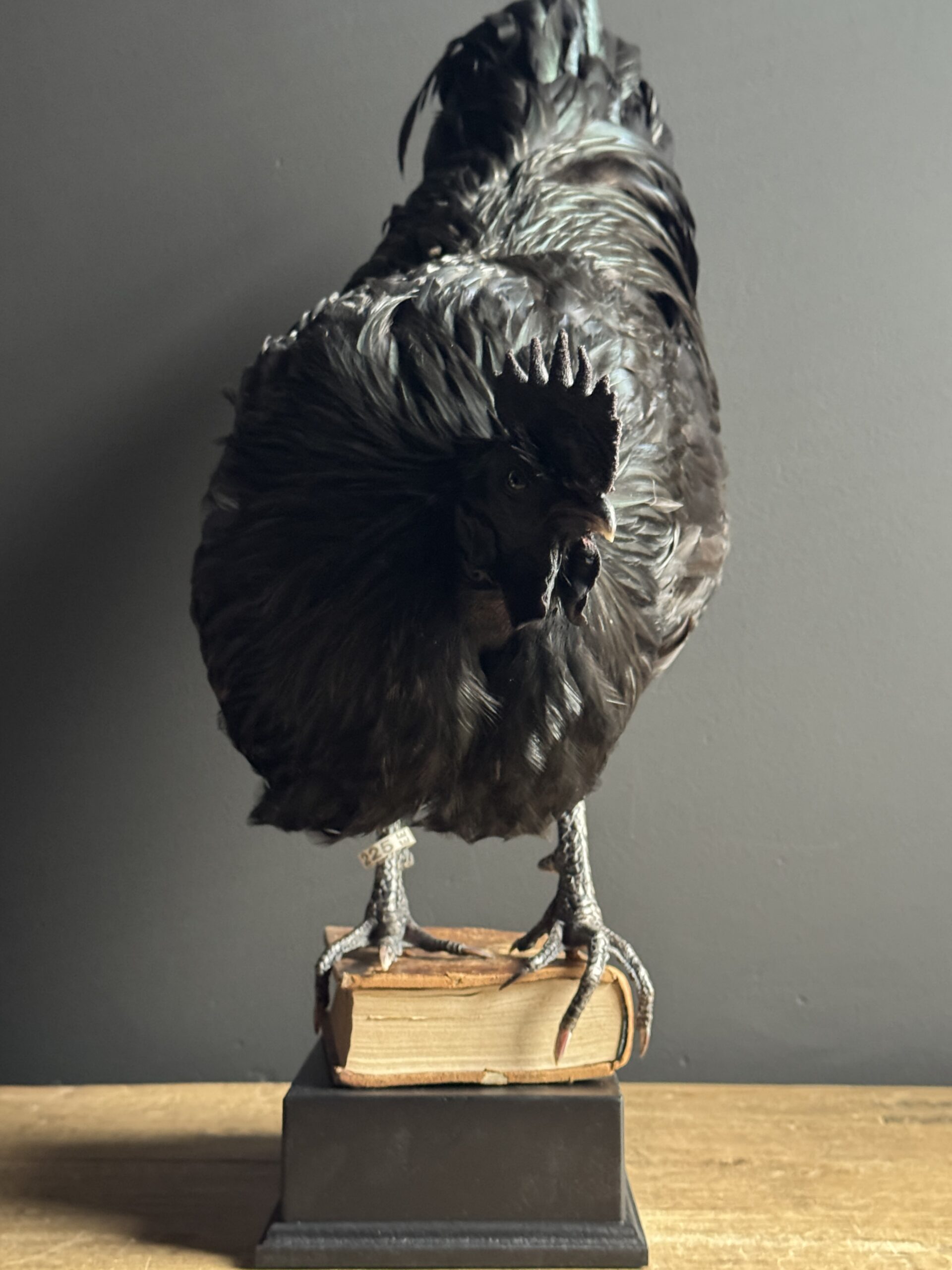 Zeer bijzonder opgezette Cemani haan. De haan is opgezet in een bijzonder statige pose.