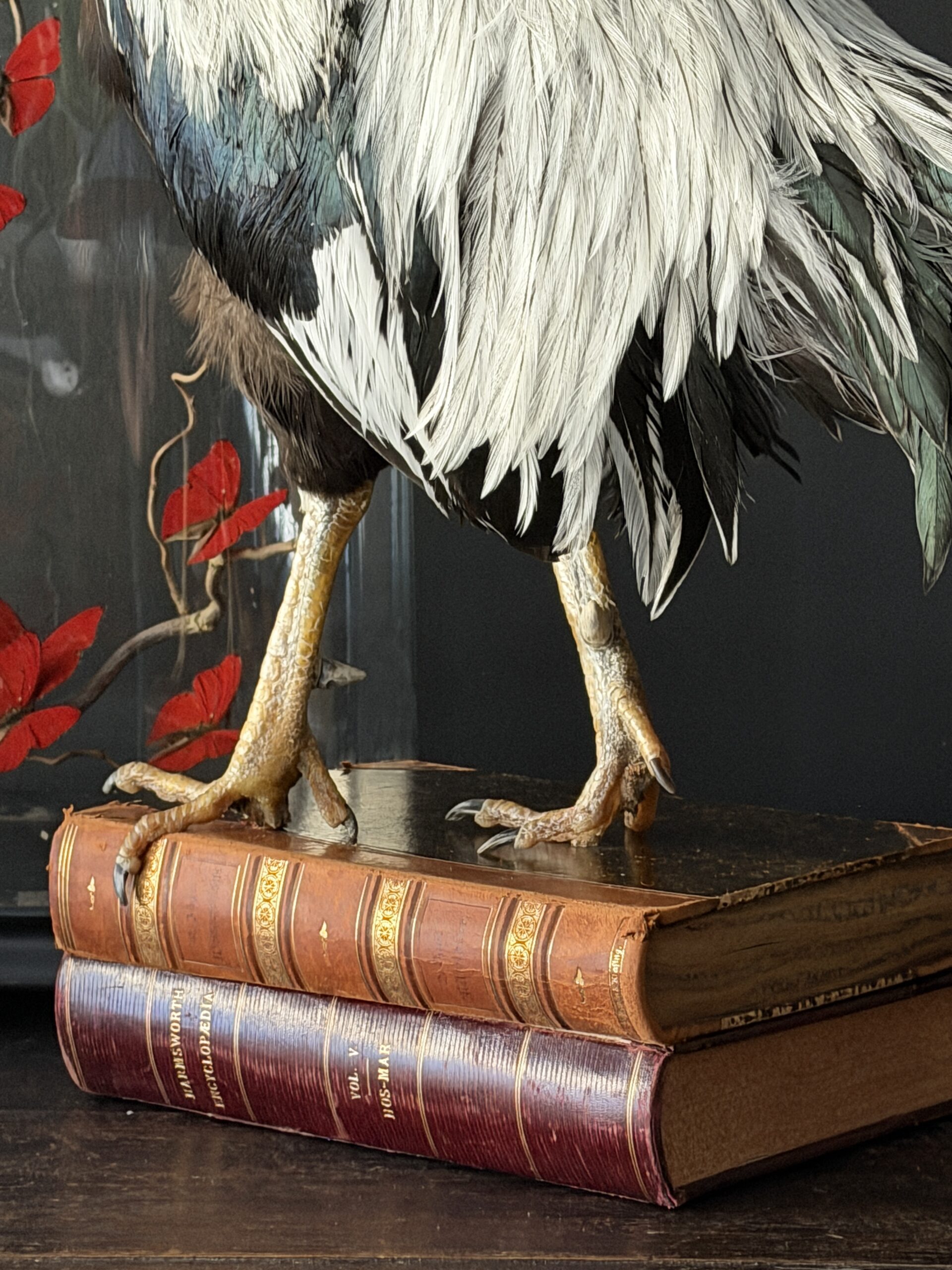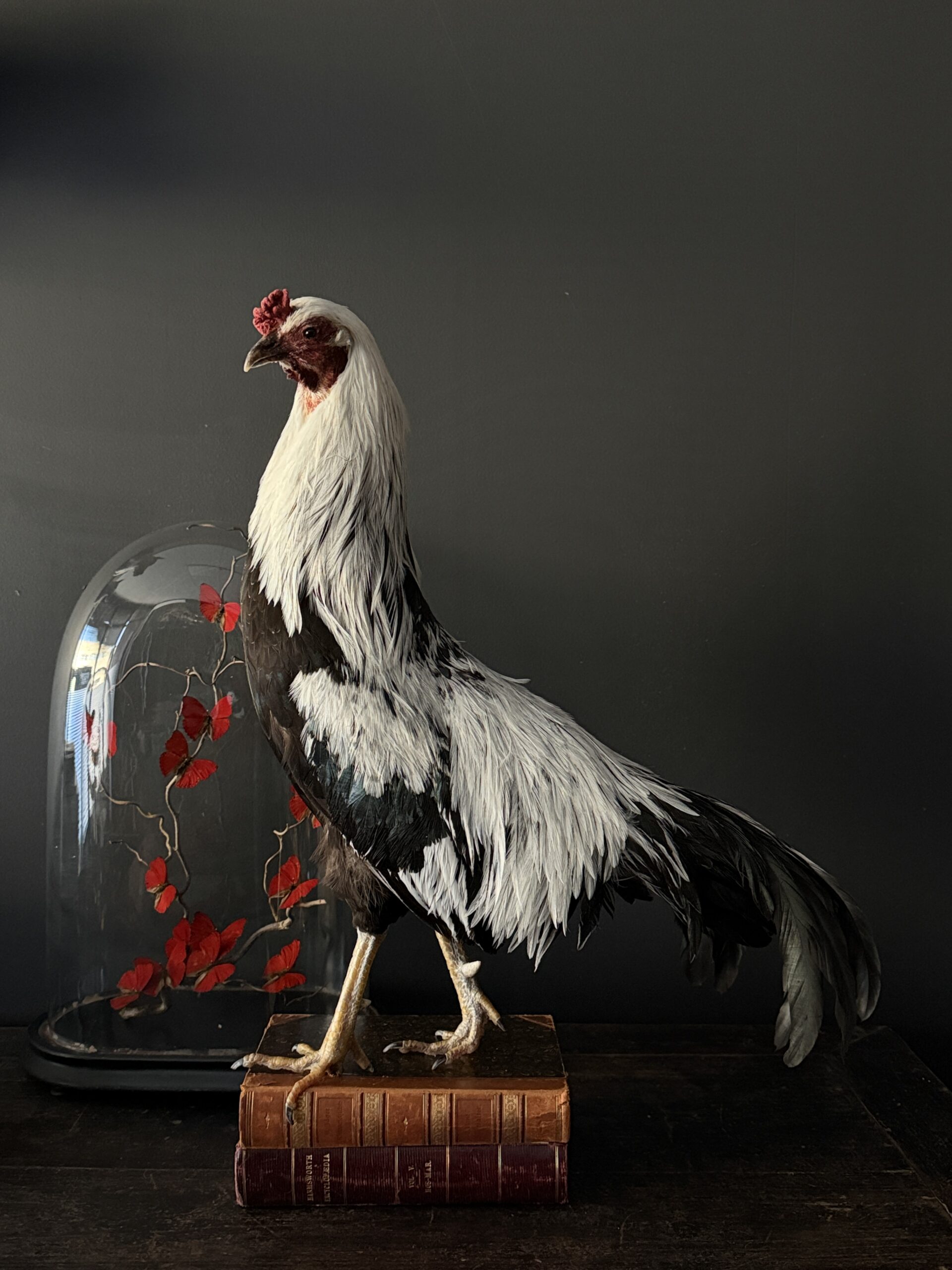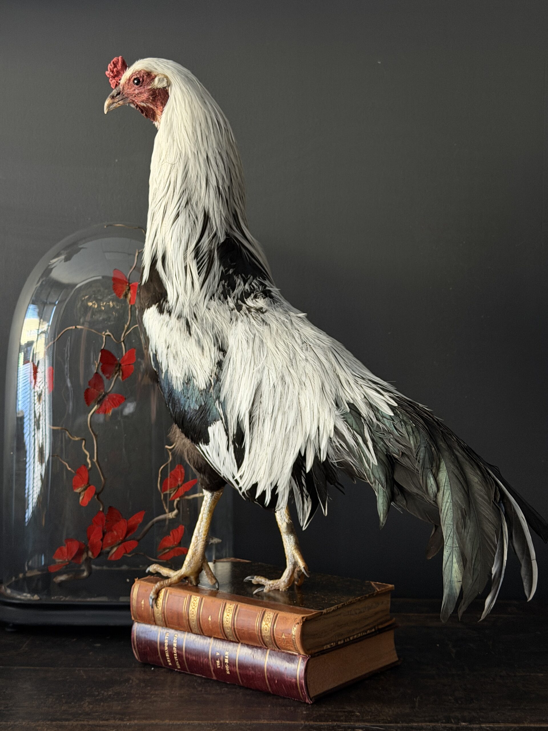 Een sierlijk opgezette haan is geplaatst op een stapel antieke boeken met leren banden. De combinatie van het verfijnde taxidermiewerk en de historische boeken creëert een bijzonder decoratief object met een klassieke uitstraling. De haan staat stevig gemonteerd op de boeken, waardoor het geheel een stabiel en stijlvol geheel vormt dat zowel in een modern als klassiek interieur tot zijn recht komt.