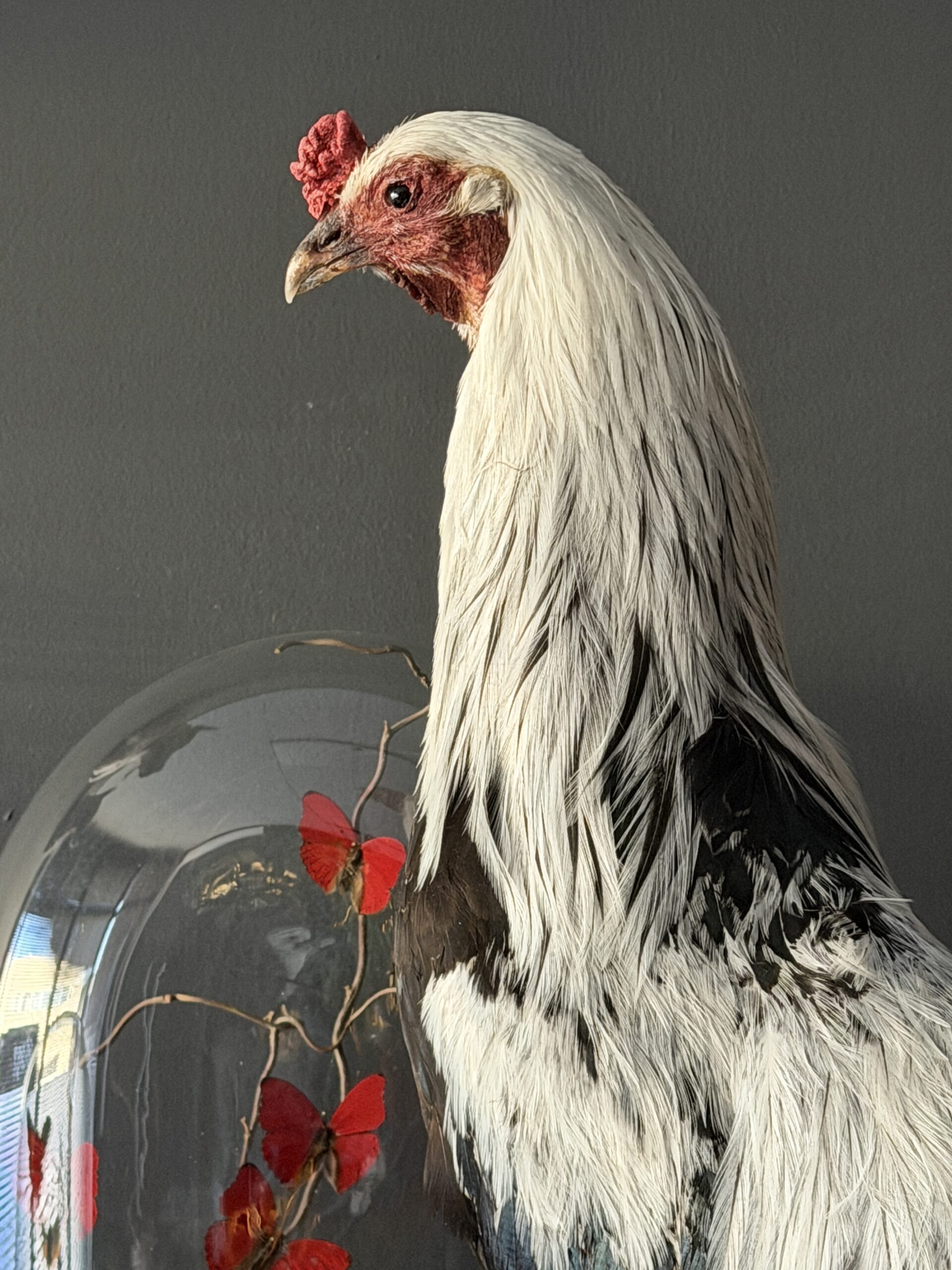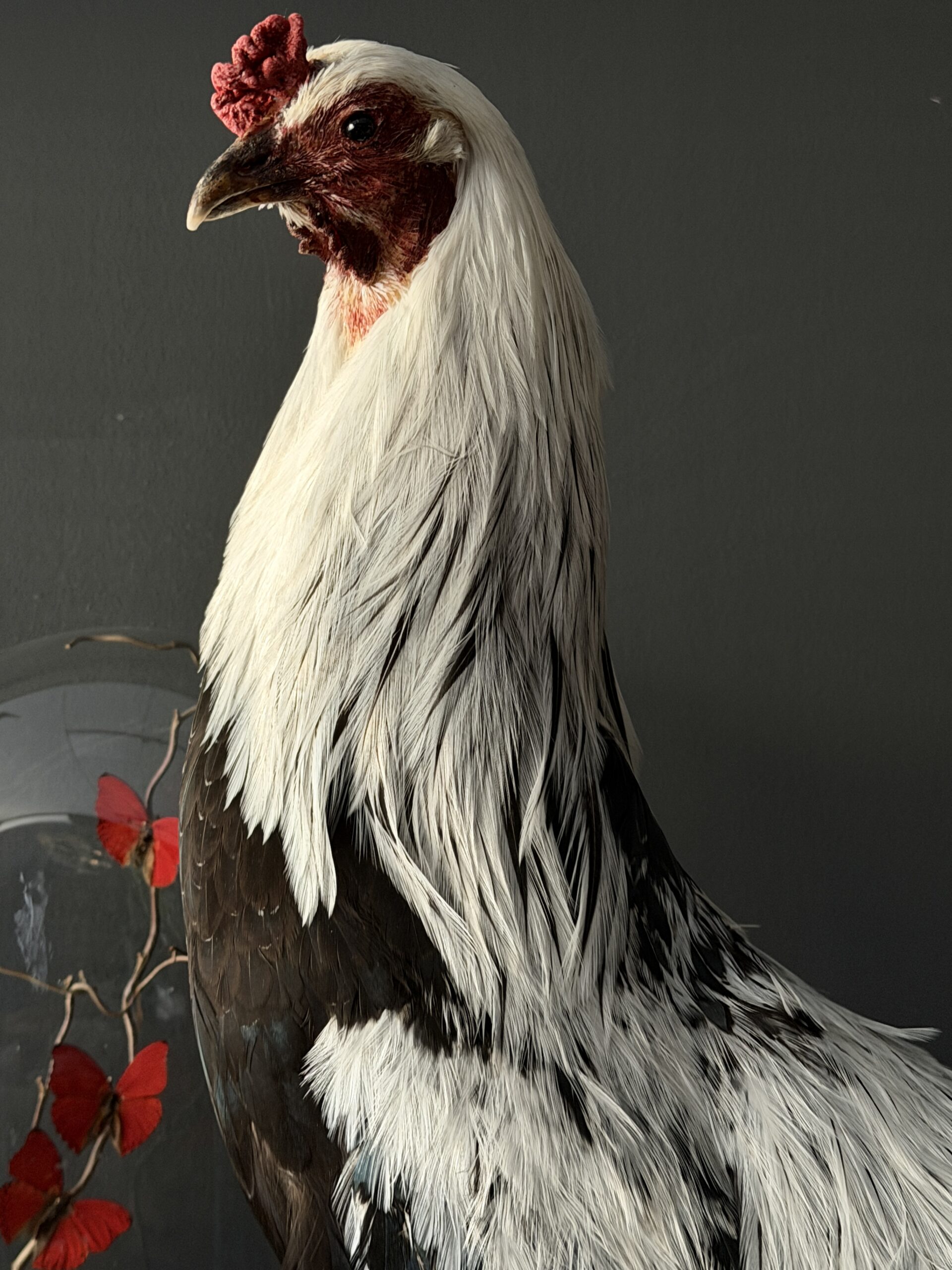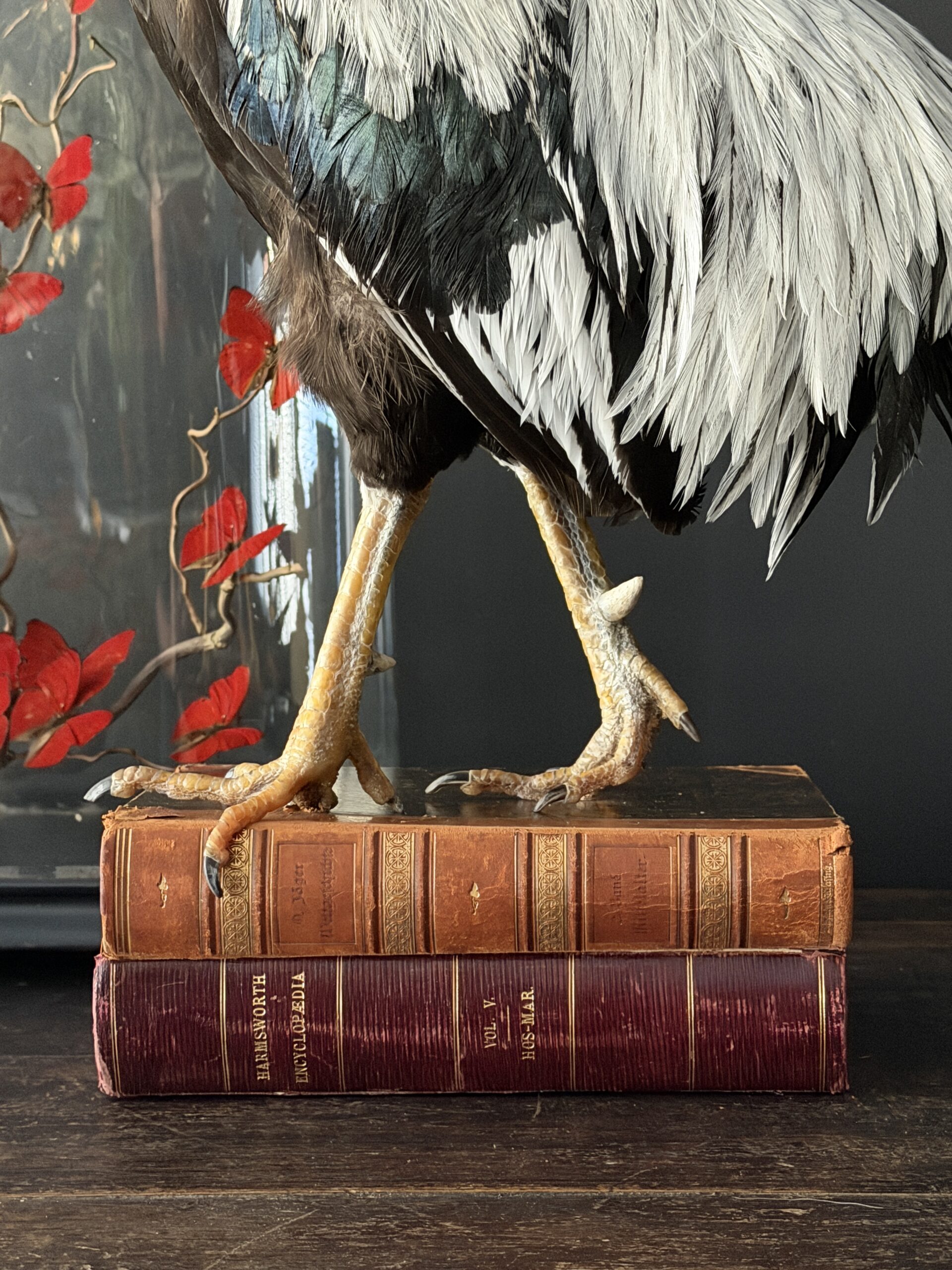 Een sierlijk opgezette haan is geplaatst op een stapel antieke boeken met leren banden. De combinatie van het verfijnde taxidermiewerk en de historische boeken creëert een bijzonder decoratief object met een klassieke uitstraling. De haan staat stevig gemonteerd op de boeken, waardoor het geheel een stabiel en stijlvol geheel vormt dat zowel in een modern als klassiek interieur tot zijn recht komt.