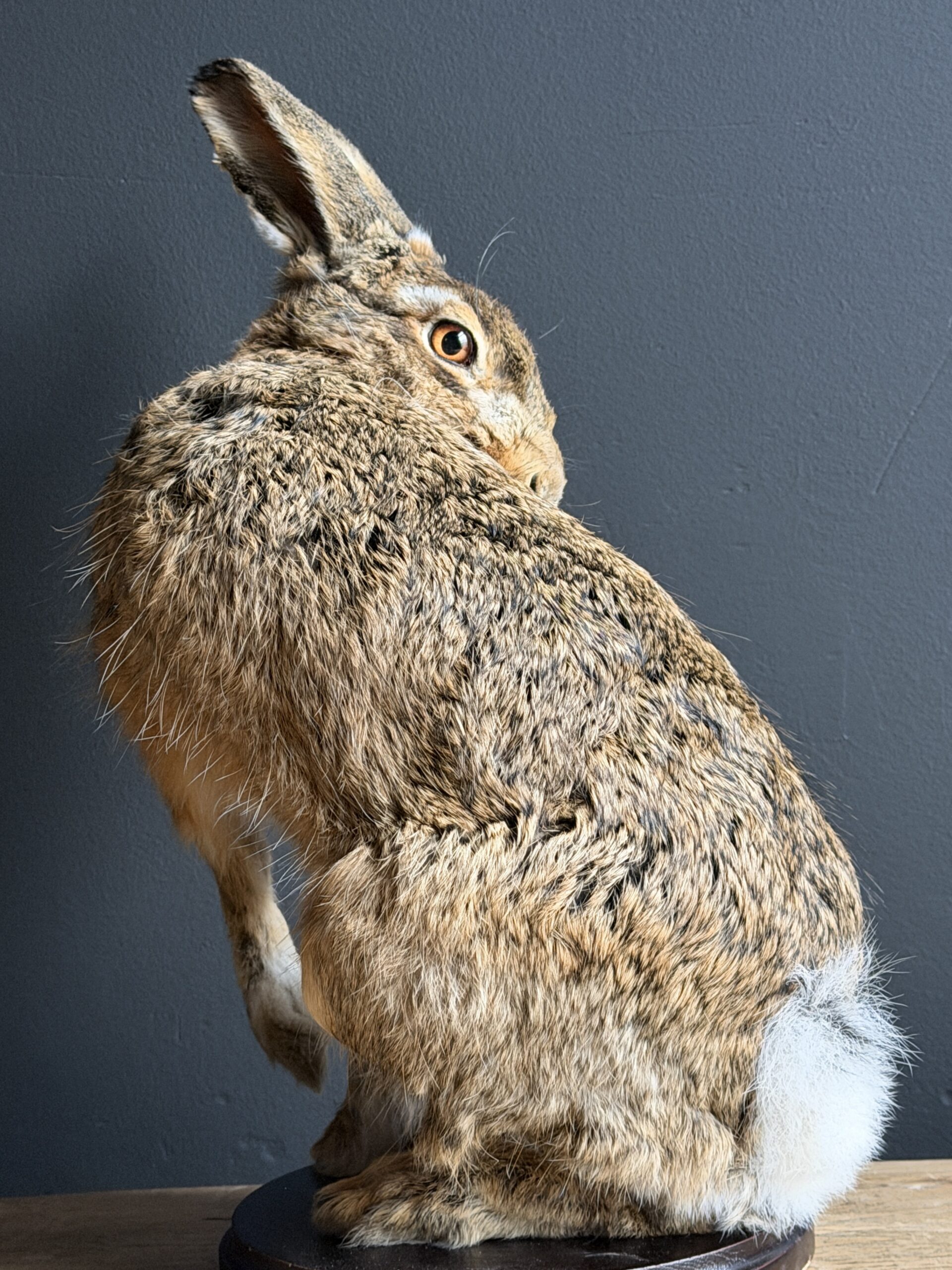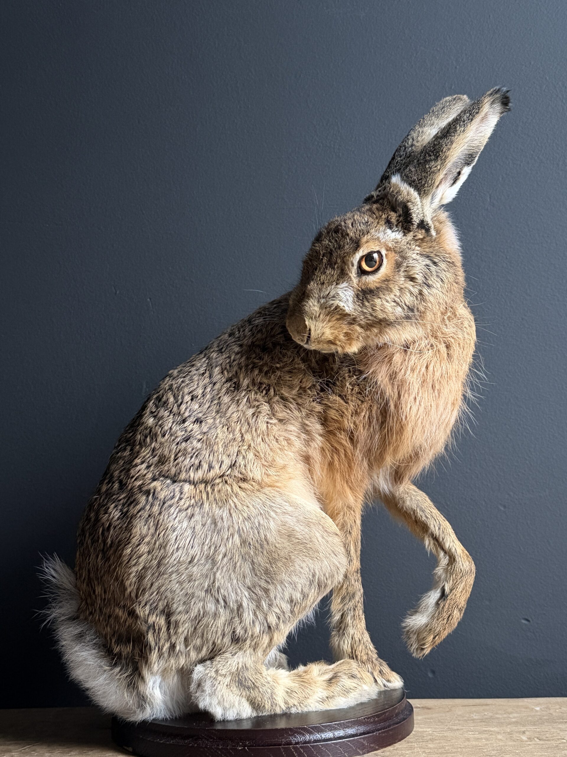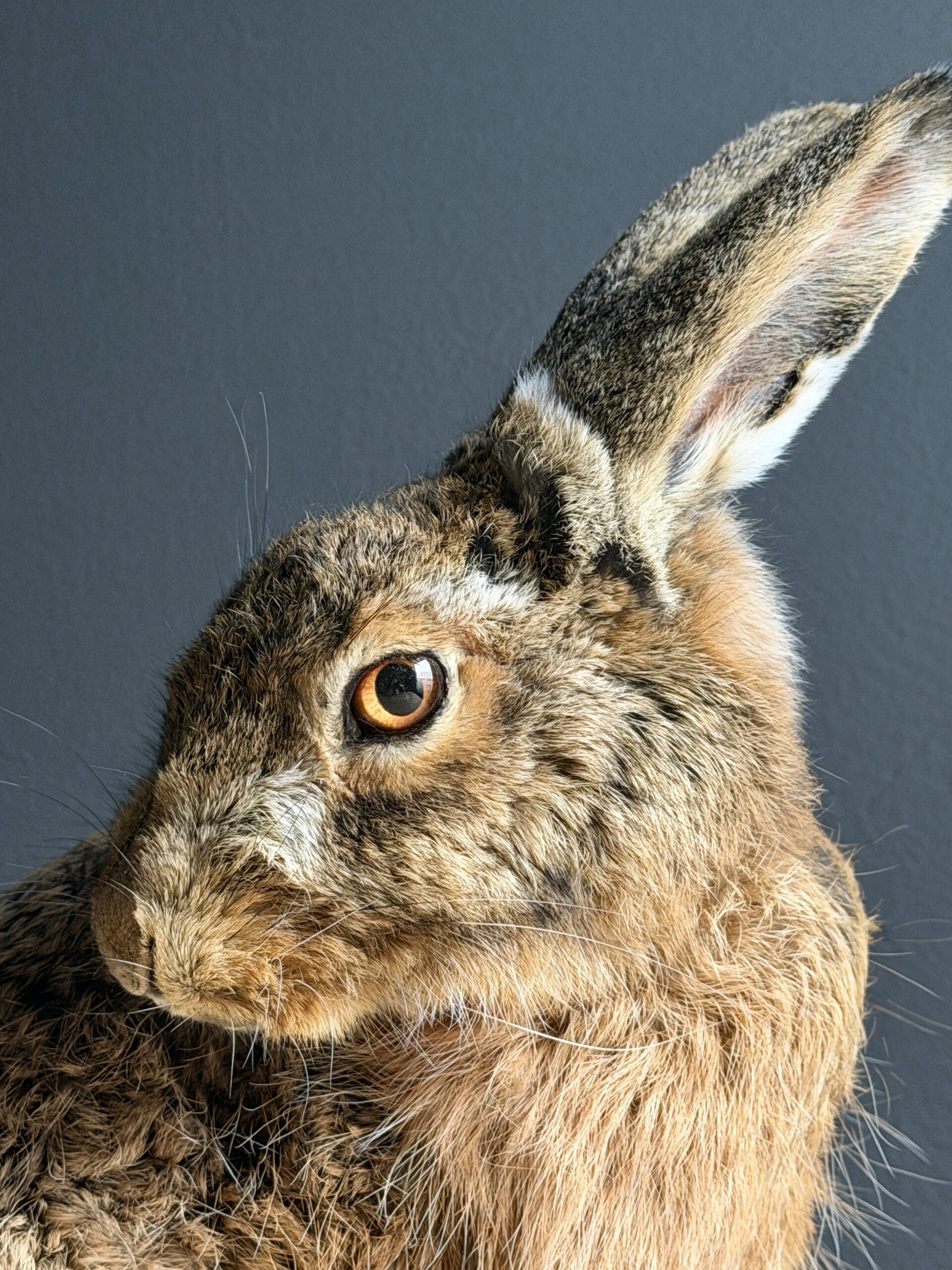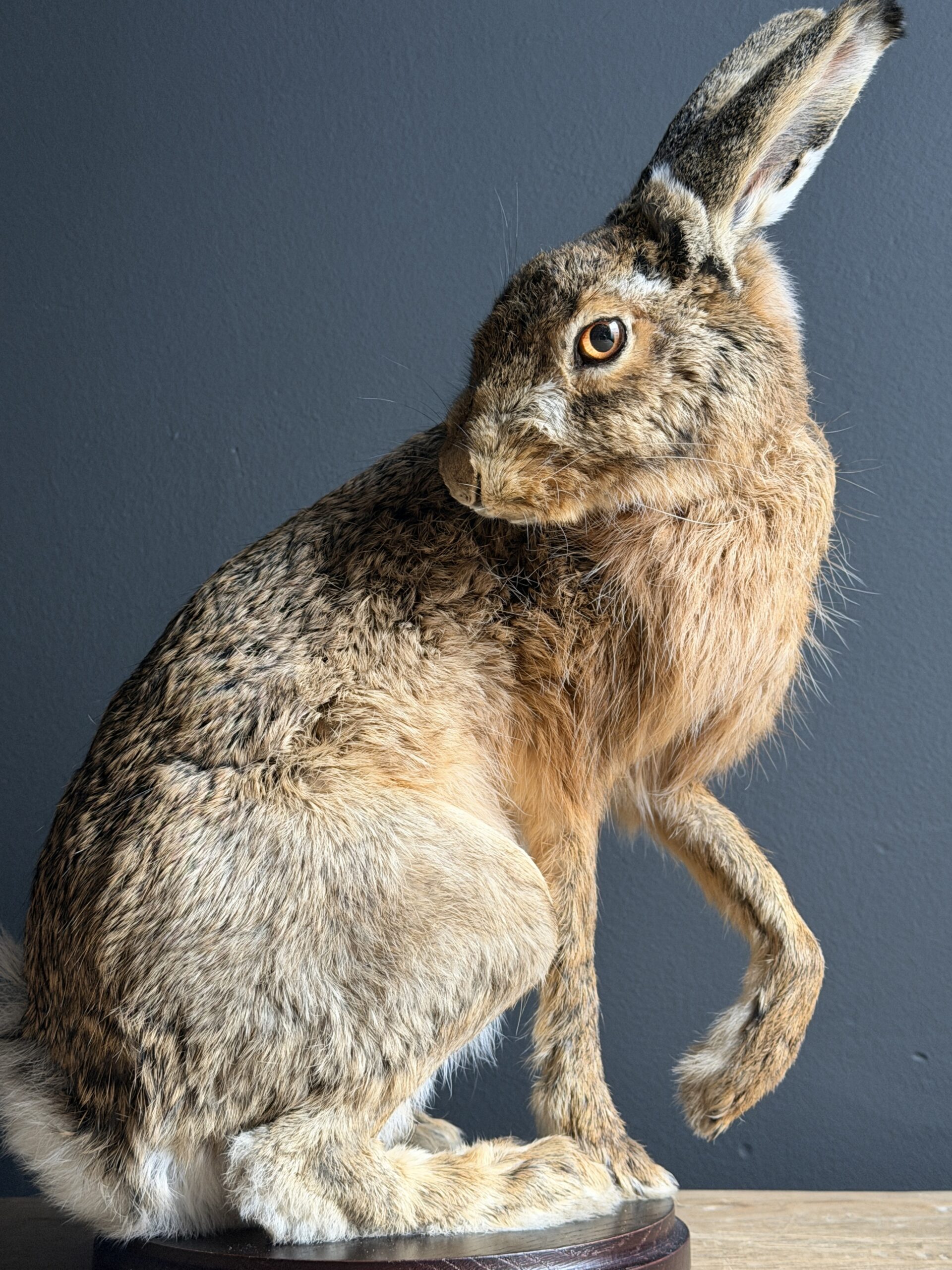 Deze opgezette haas is gepresenteerd in een natuurlijke pose en met uitzonderlijke precisie vervaardigd. De vacht en huid is tot in detail afgewerkt en zelfs de fijne haarvaatjes in de oren zijn subtiel zichtbaar, wat bijdraagt aan de indrukwekkende levensechtheid. De anatomische correctheid en zorgvuldige afwerking maken dit tot een taxidermiestuk van museumkwaliteit, geschikt voor een hoogwaardige presentatie.