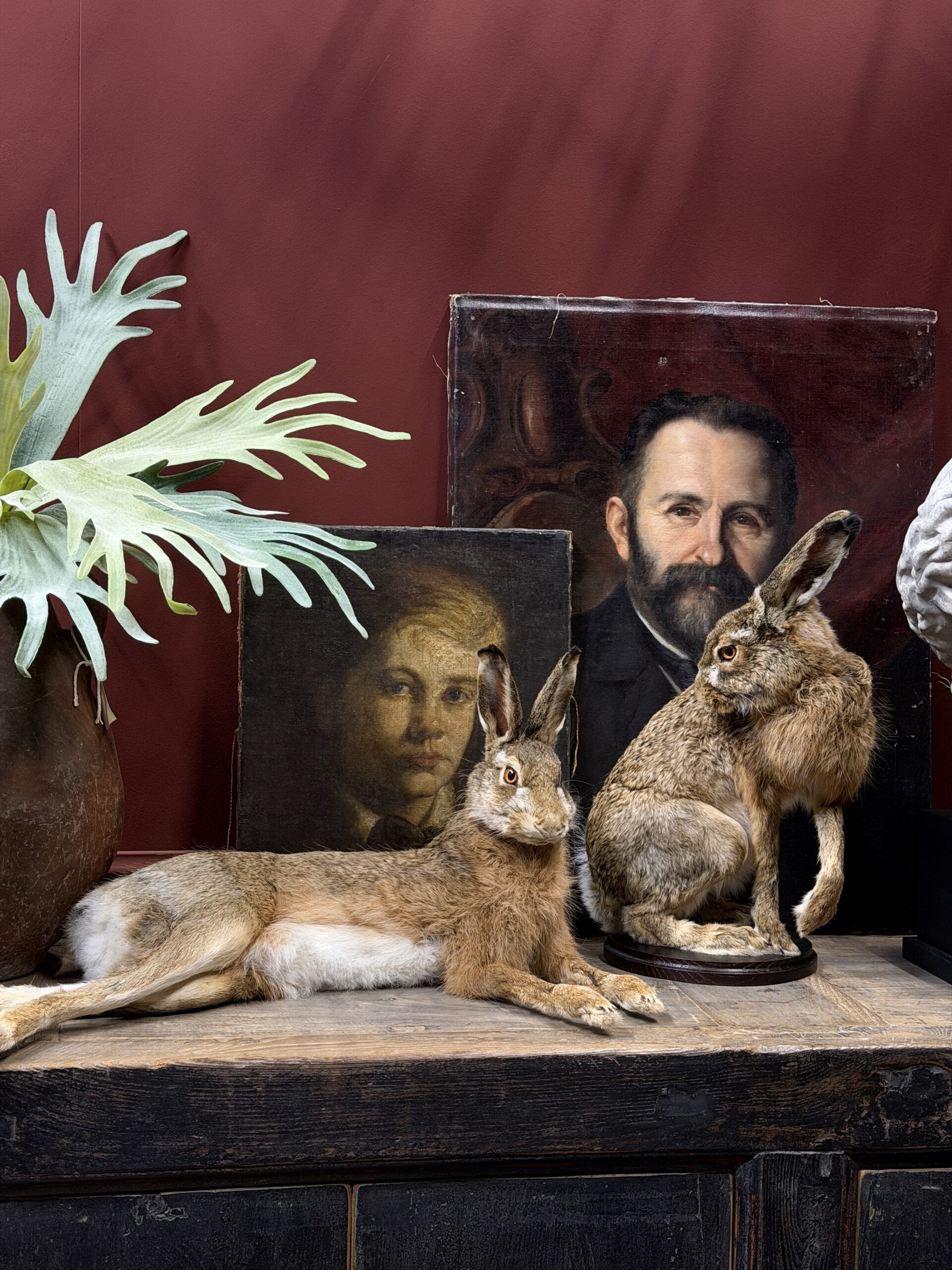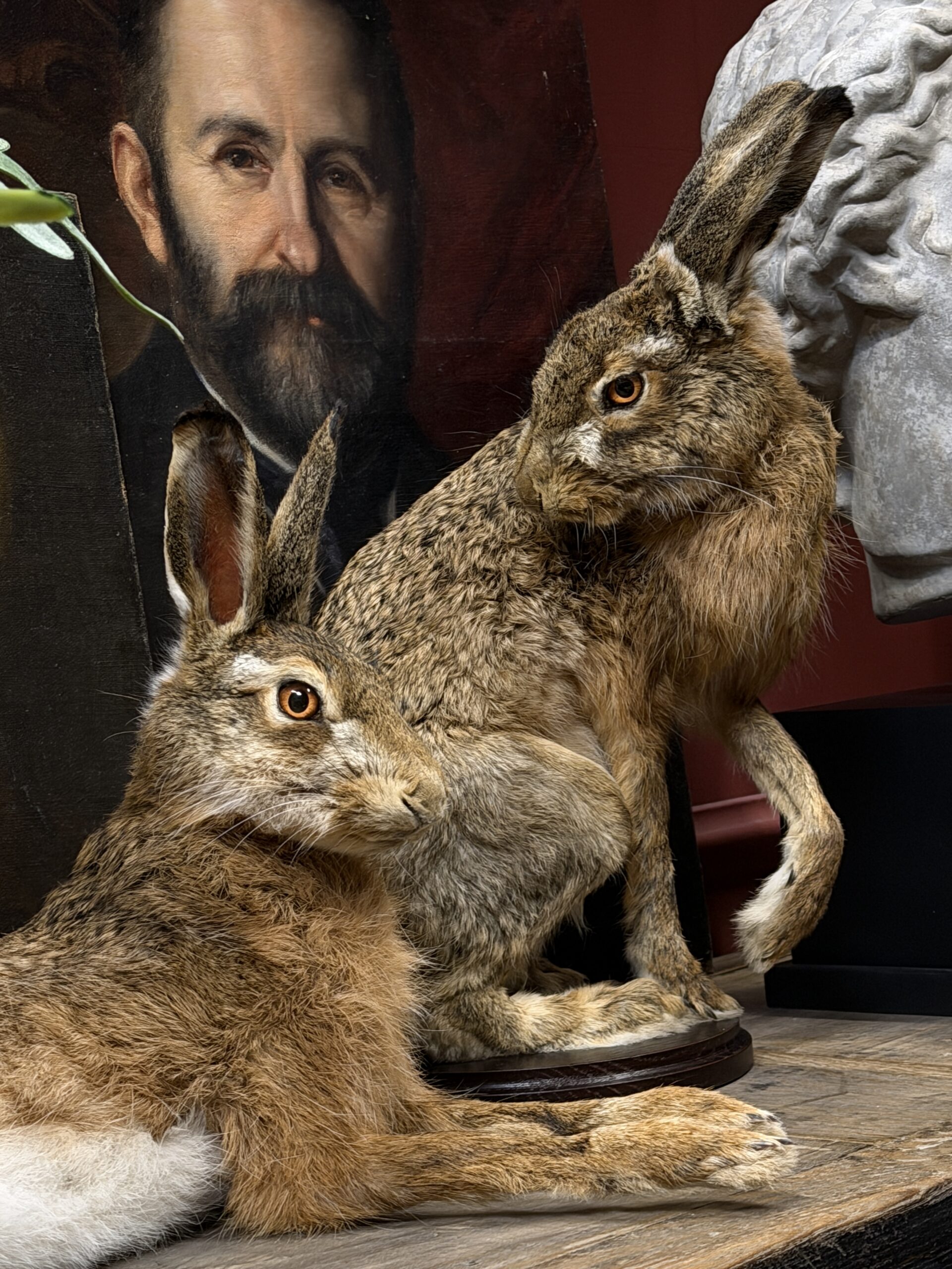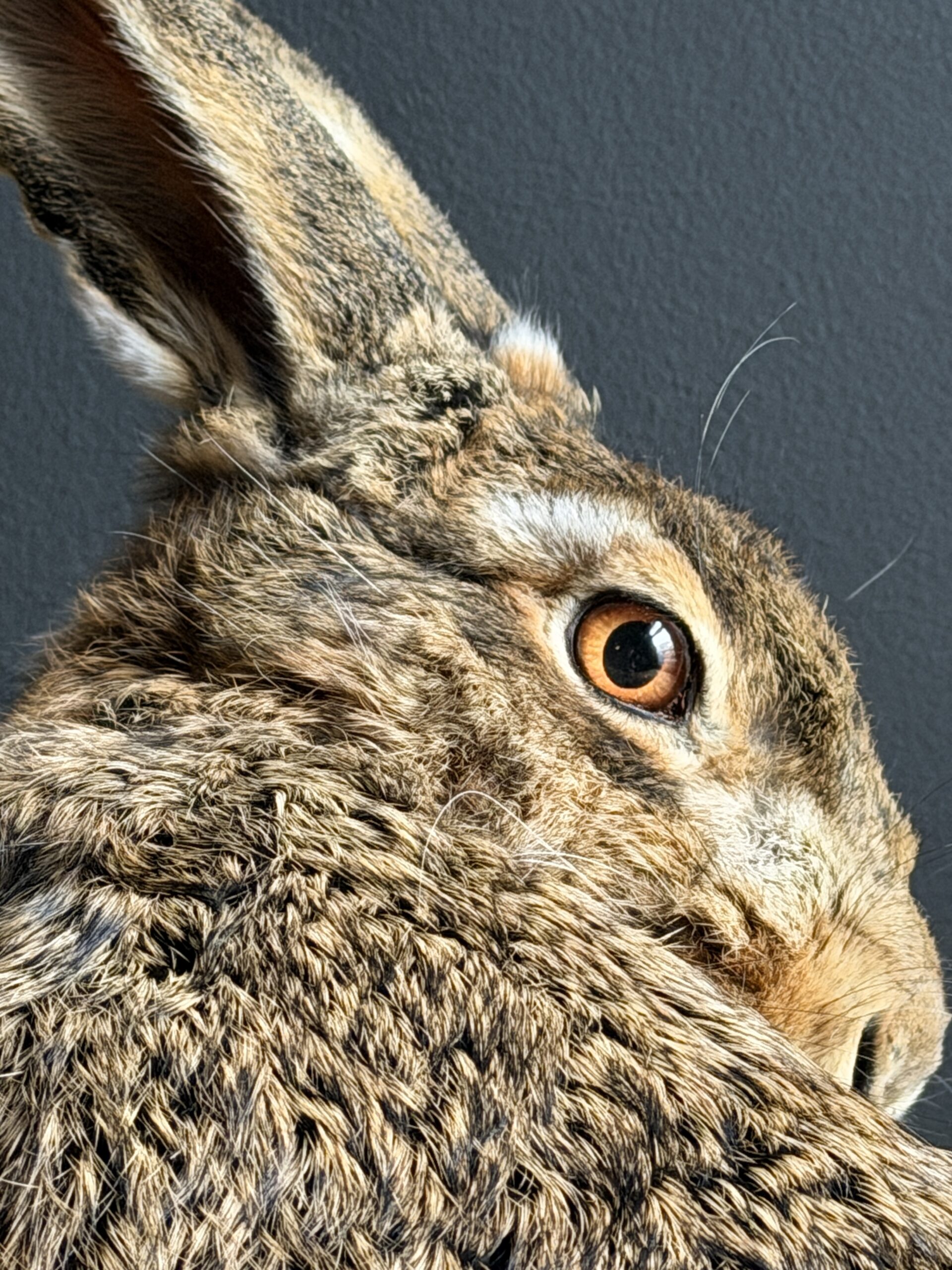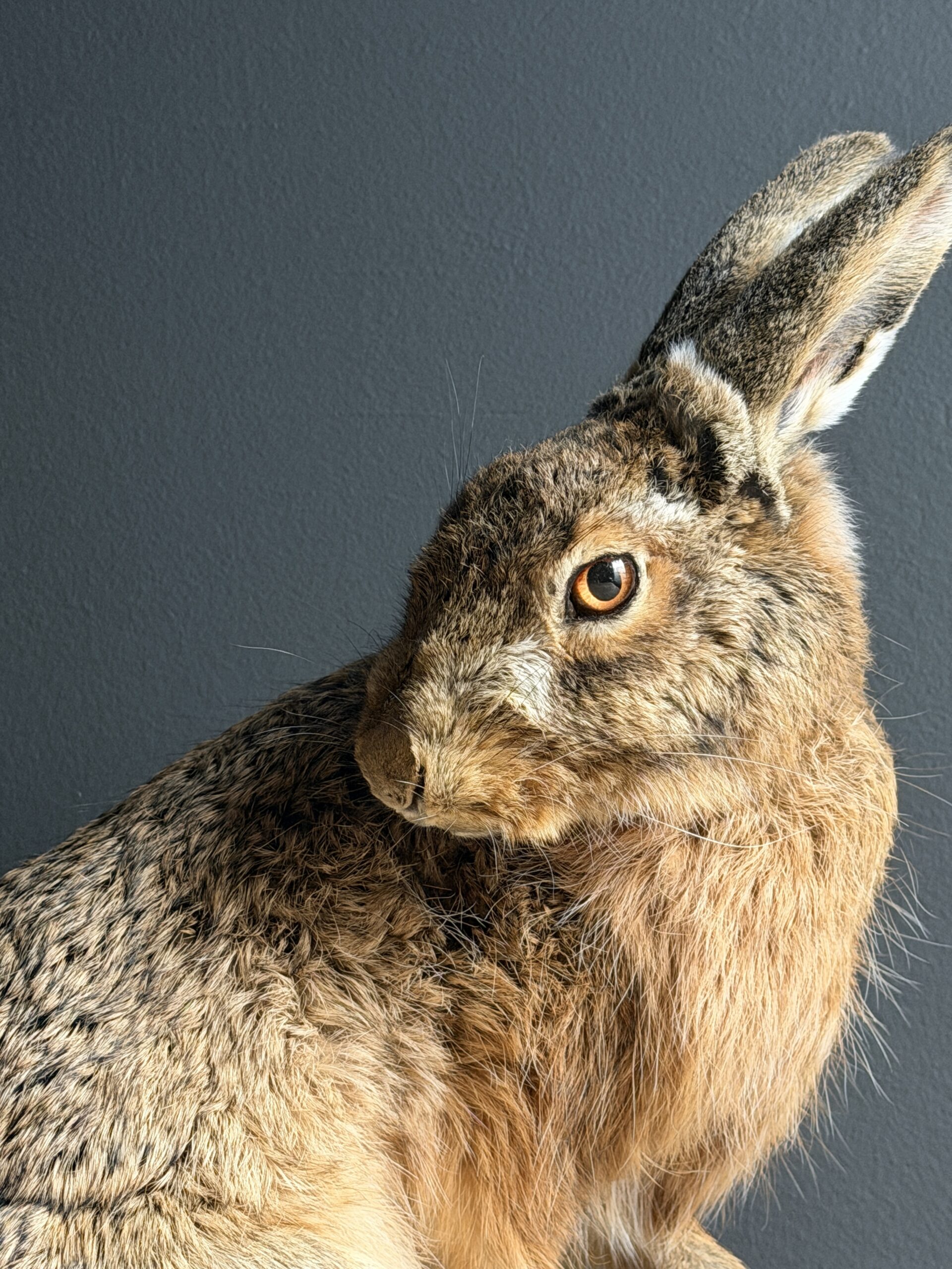 Deze opgezette haas is gepresenteerd in een natuurlijke pose en met uitzonderlijke precisie vervaardigd. De vacht en huid is tot in detail afgewerkt en zelfs de fijne haarvaatjes in de oren zijn subtiel zichtbaar, wat bijdraagt aan de indrukwekkende levensechtheid. De anatomische correctheid en zorgvuldige afwerking maken dit tot een taxidermiestuk van museumkwaliteit, geschikt voor een hoogwaardige presentatie.