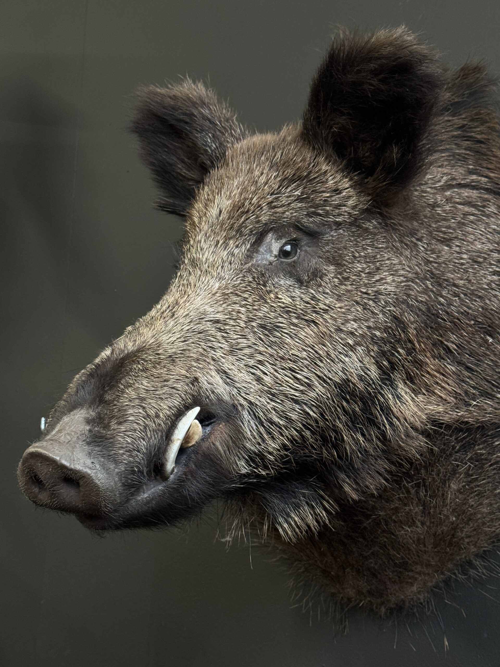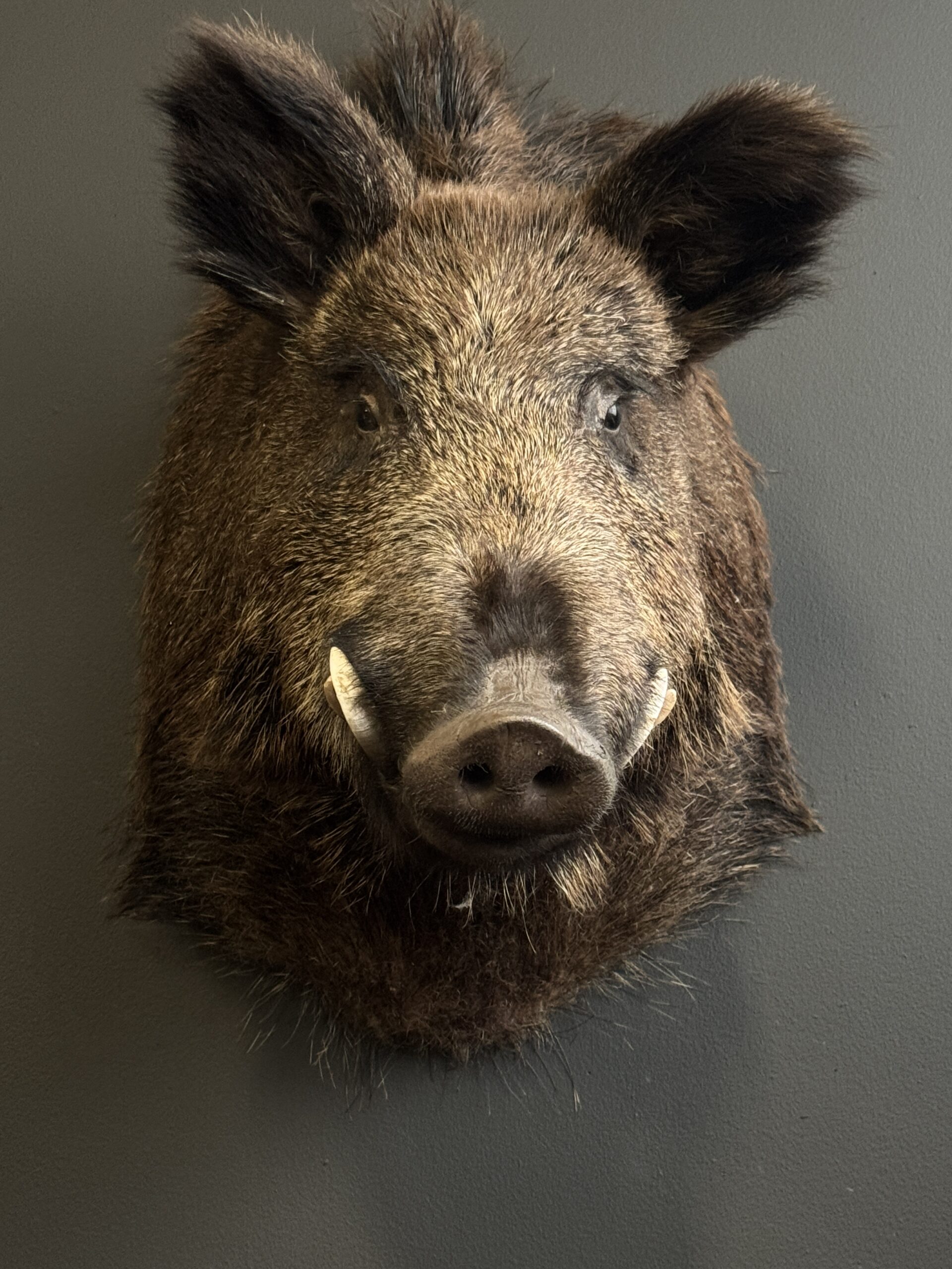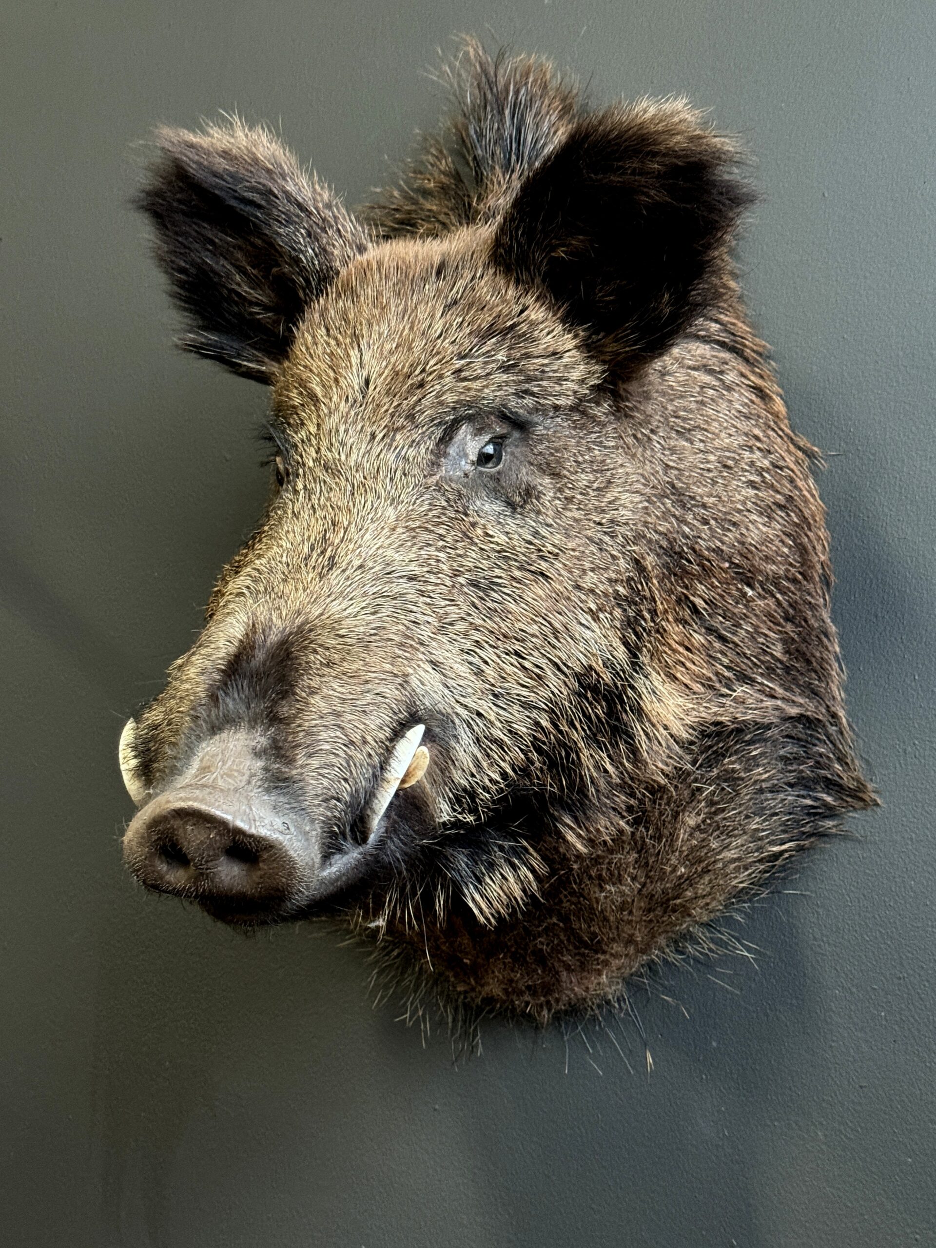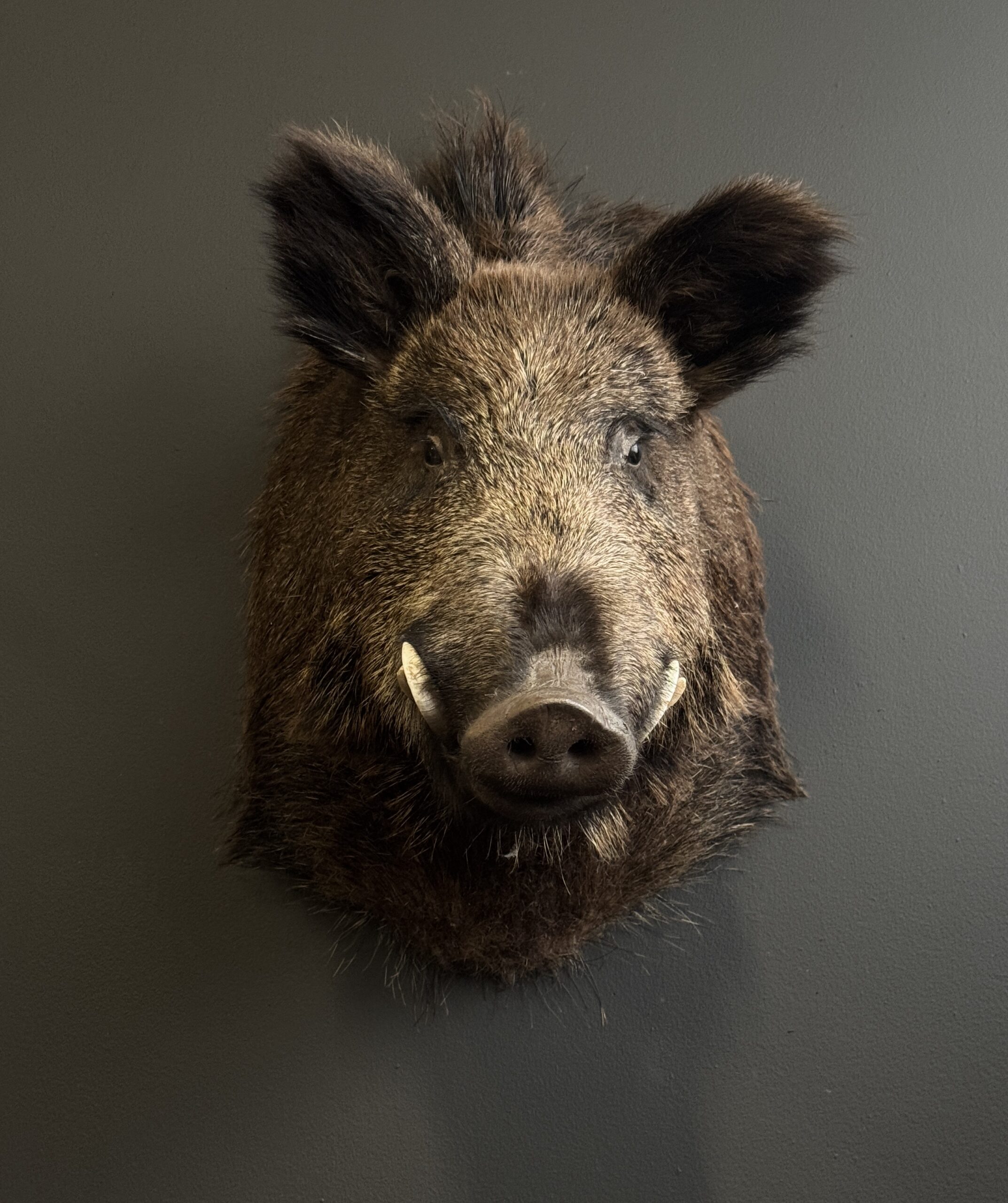 Deze opgezette kop van een wild zwijn is een echte blikvanger voor een stoer en authentiek interieur. Hij heeft een mooie, karakteristieke uitstraling en brengt direct een robuuste sfeer in huis, mancave of jachthut.