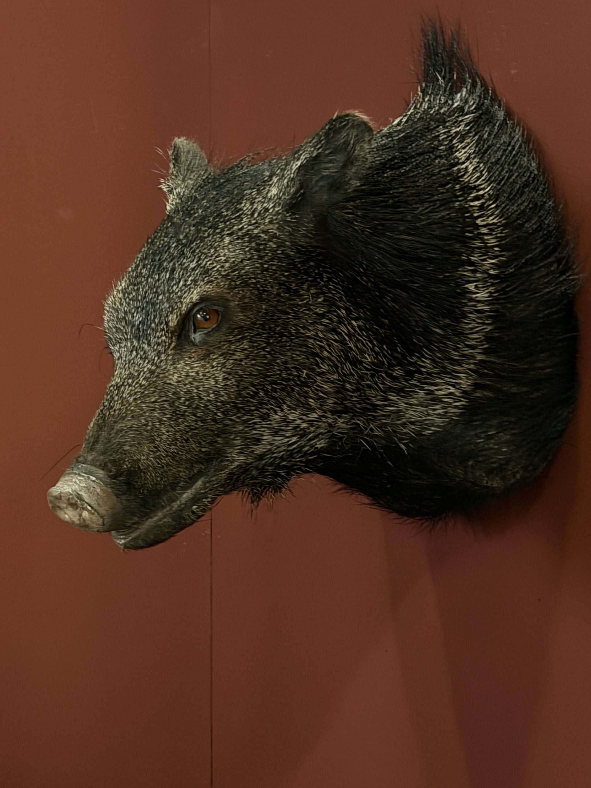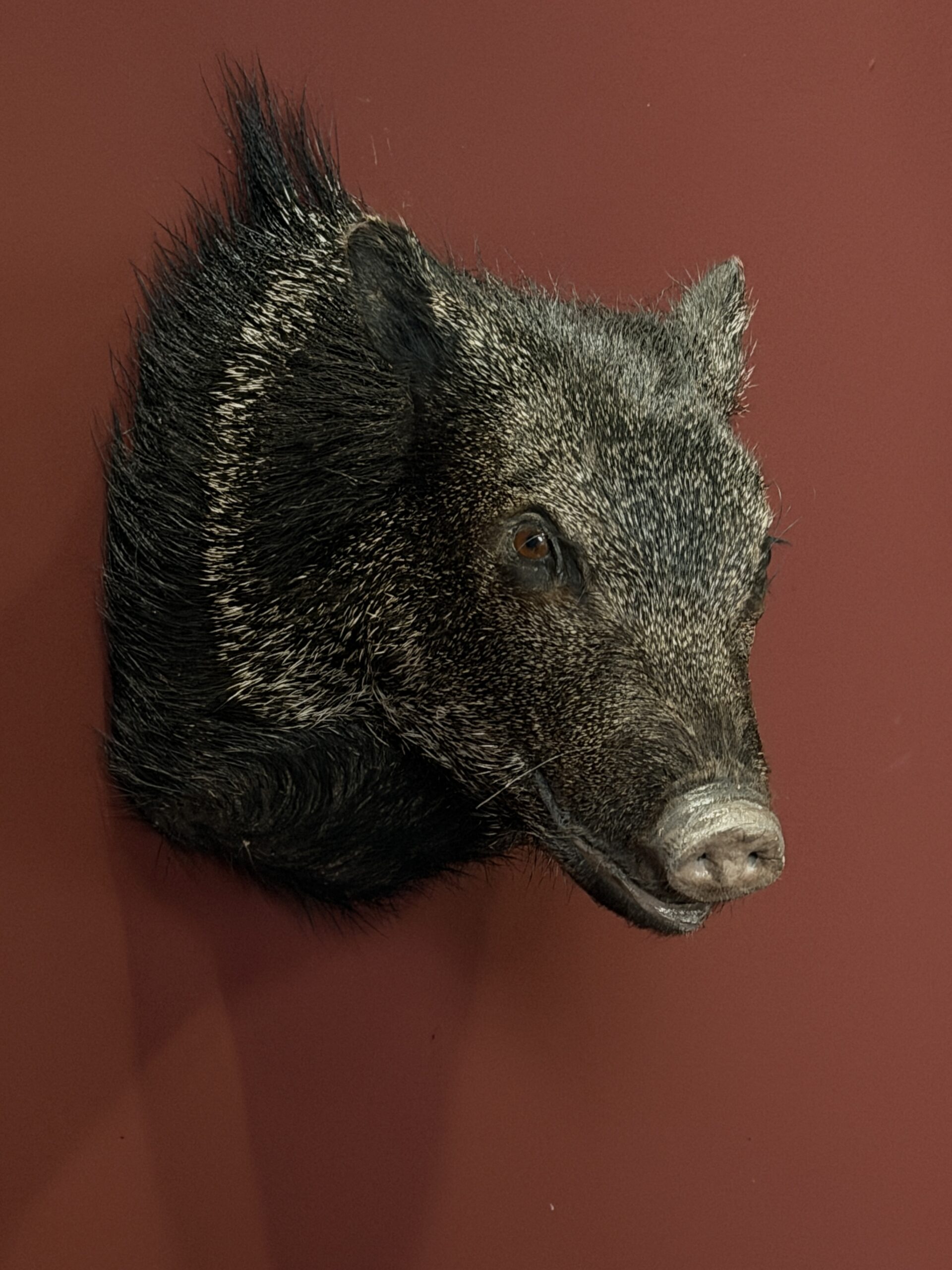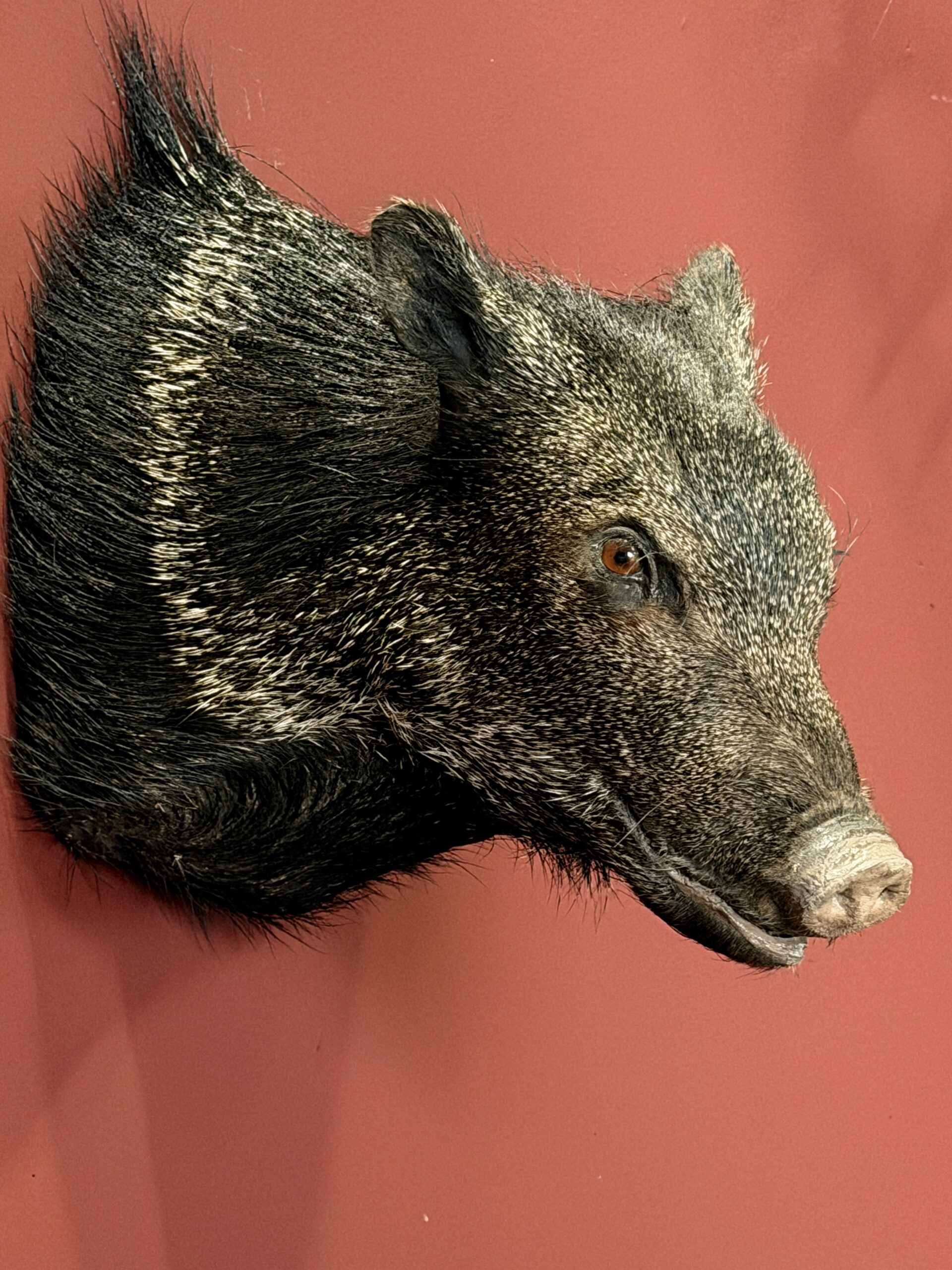 Opgezette kop van een Pekari. Bijzondere opgezette kop en klein van formaat.