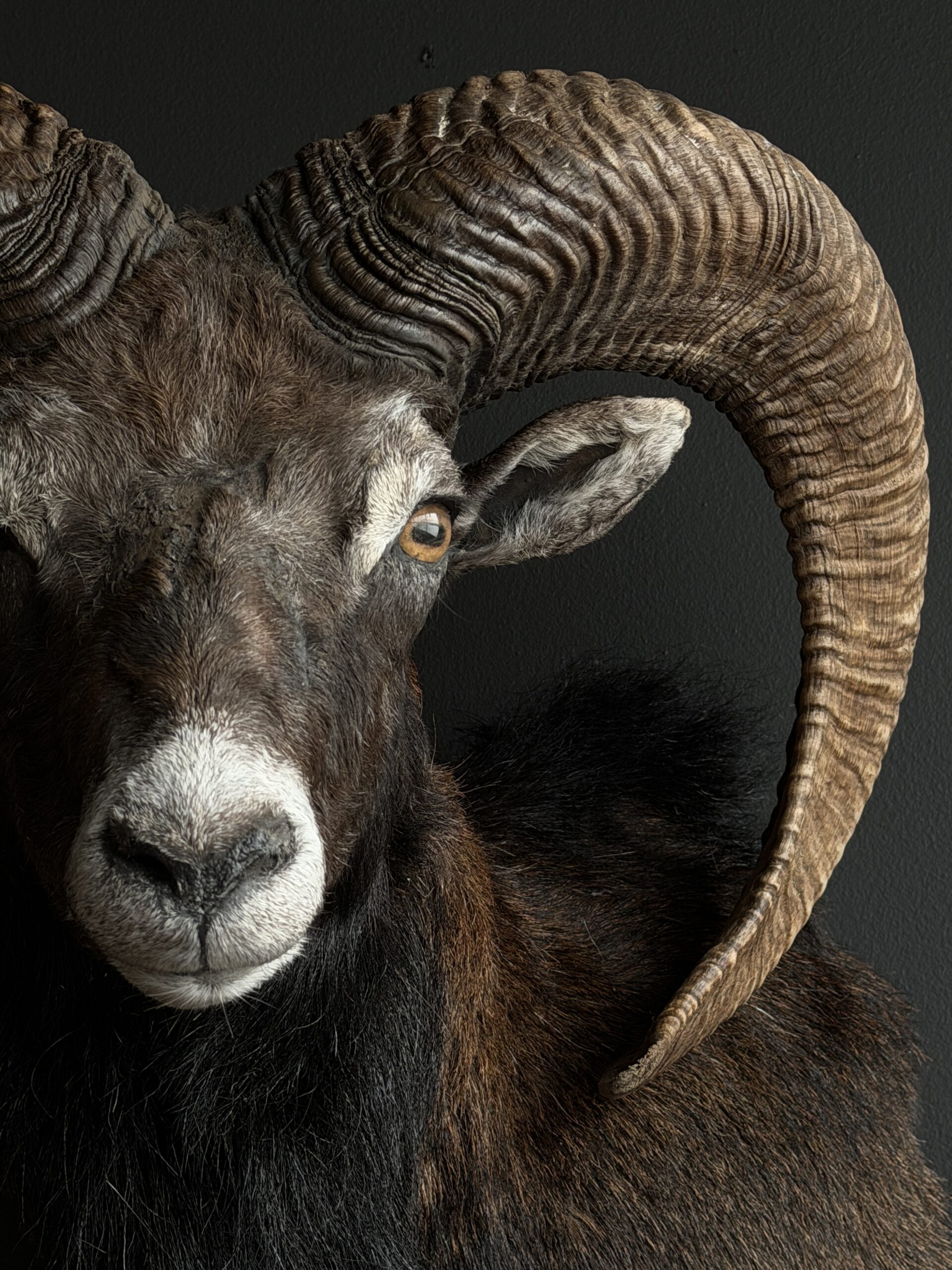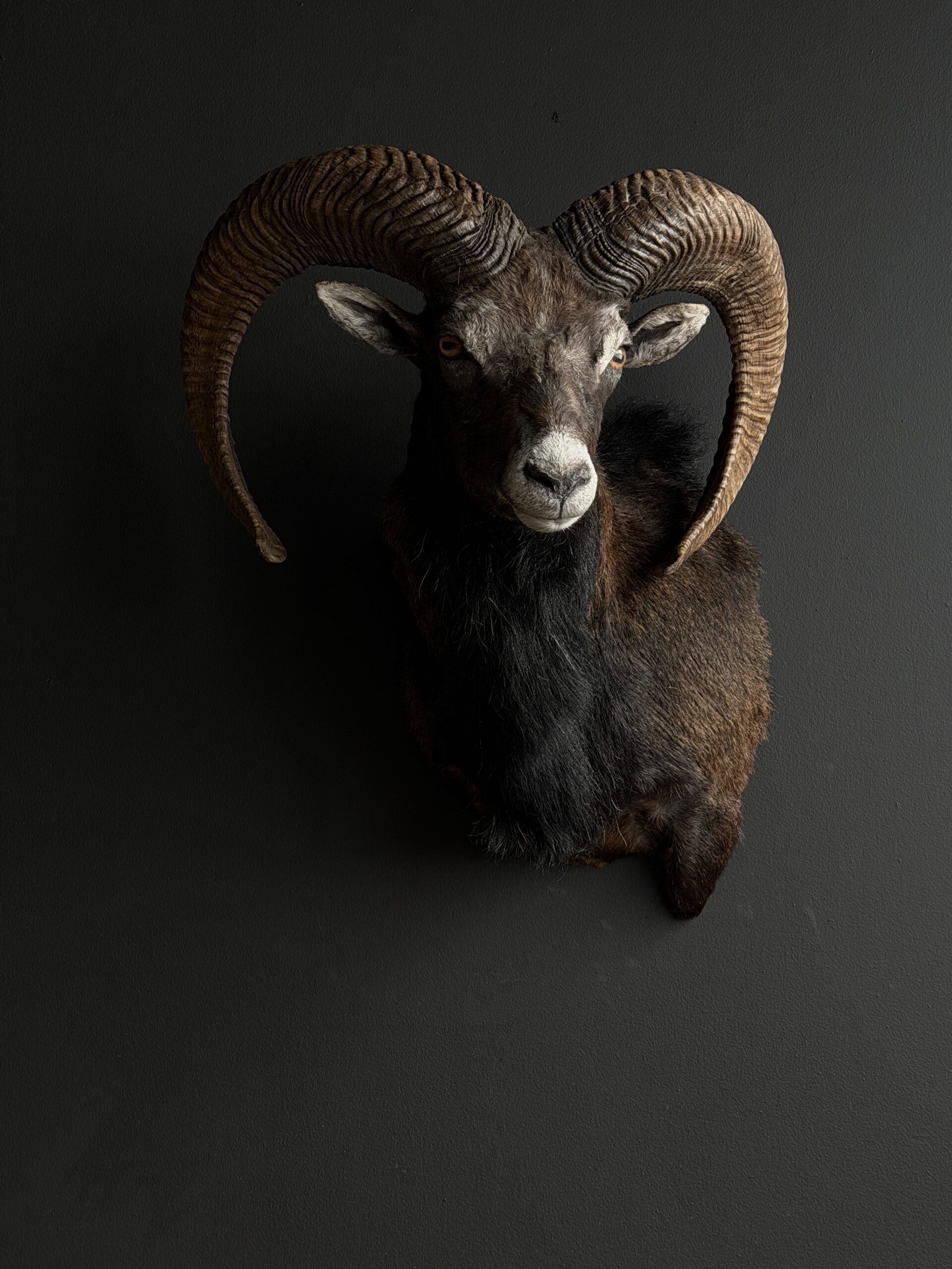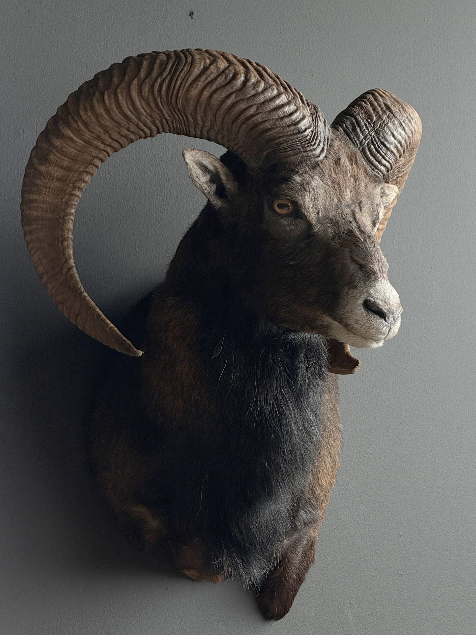 Deze prachtige opgezette kop van een zeer grote moeflon is een mooi decoratief item. De moeflon is een soort wild schaap dat bekend staat om zijn grote, gekrulde hoorns. Deze opgezette moeflon wordt zorgvuldig gemaakt met veel oog voor detail, zodat het er realistisch uitziet.