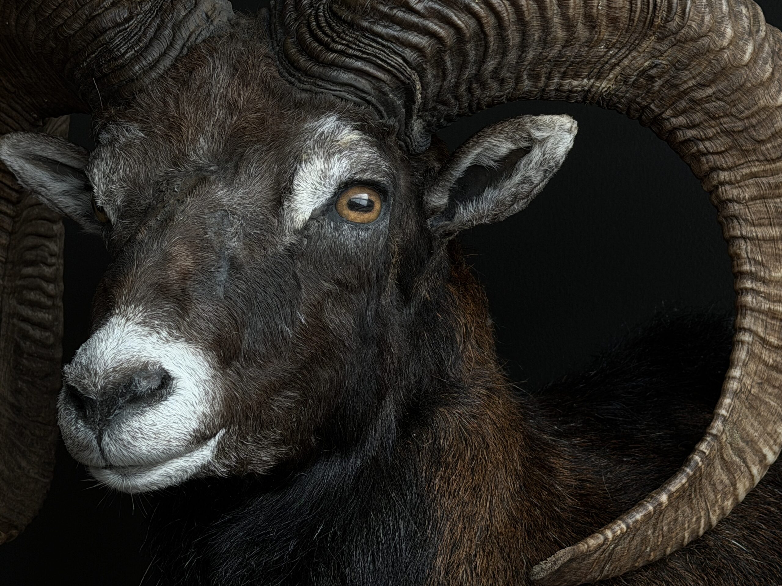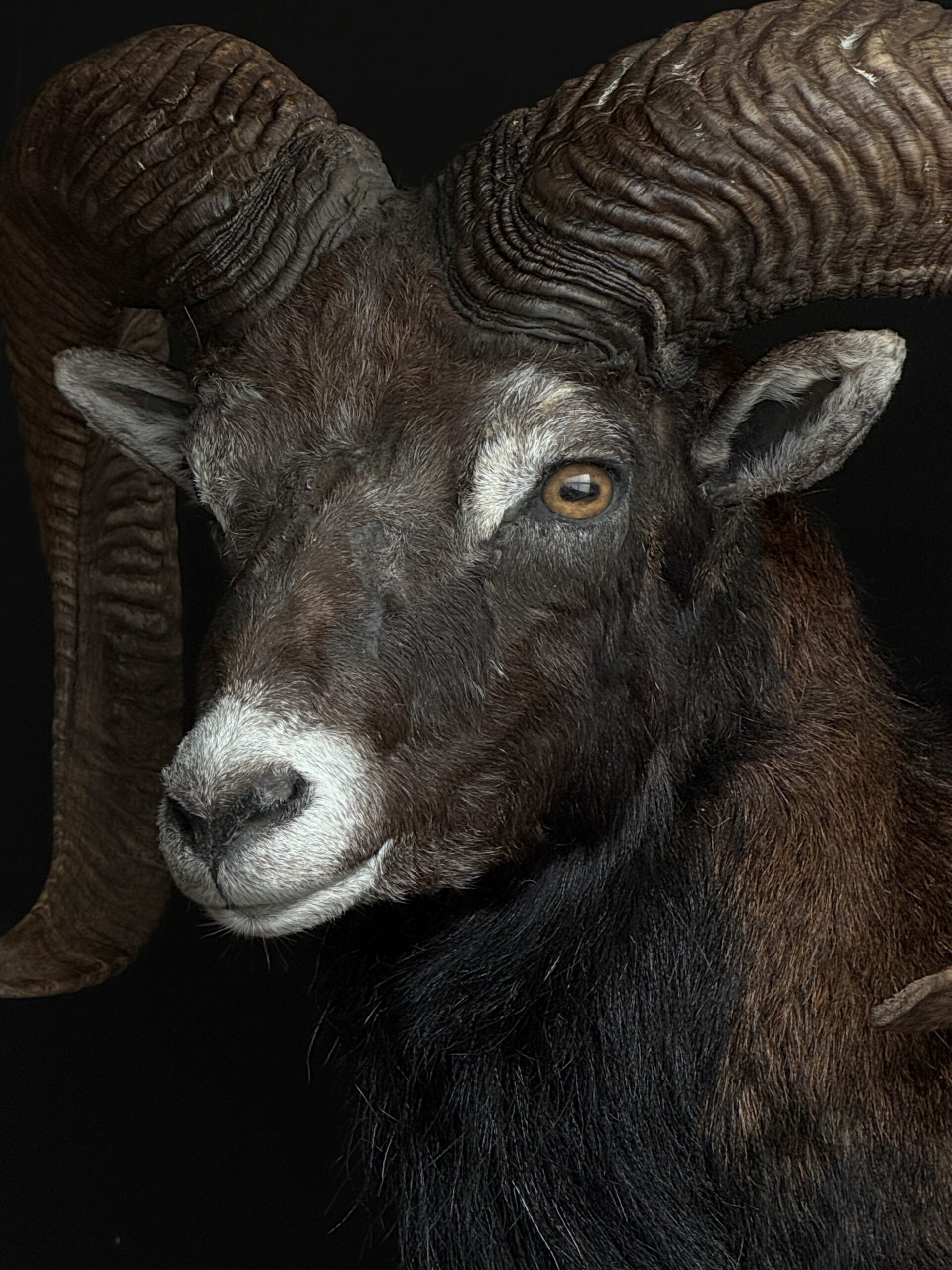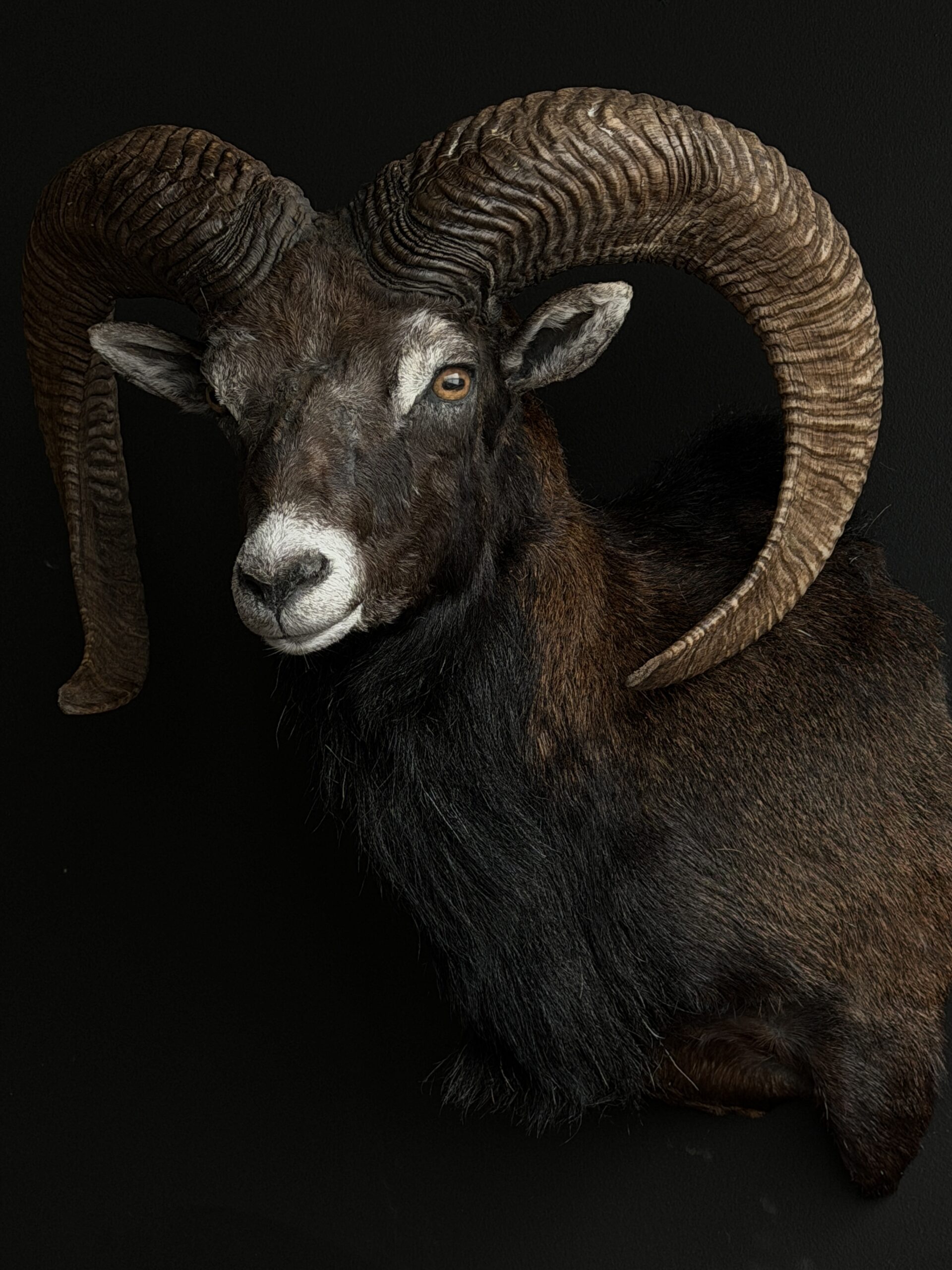 Deze prachtige opgezette kop van een zeer grote moeflon is een mooi decoratief item. De moeflon is een soort wild schaap dat bekend staat om zijn grote, gekrulde hoorns. Deze opgezette moeflon wordt zorgvuldig gemaakt met veel oog voor detail, zodat het er realistisch uitziet.