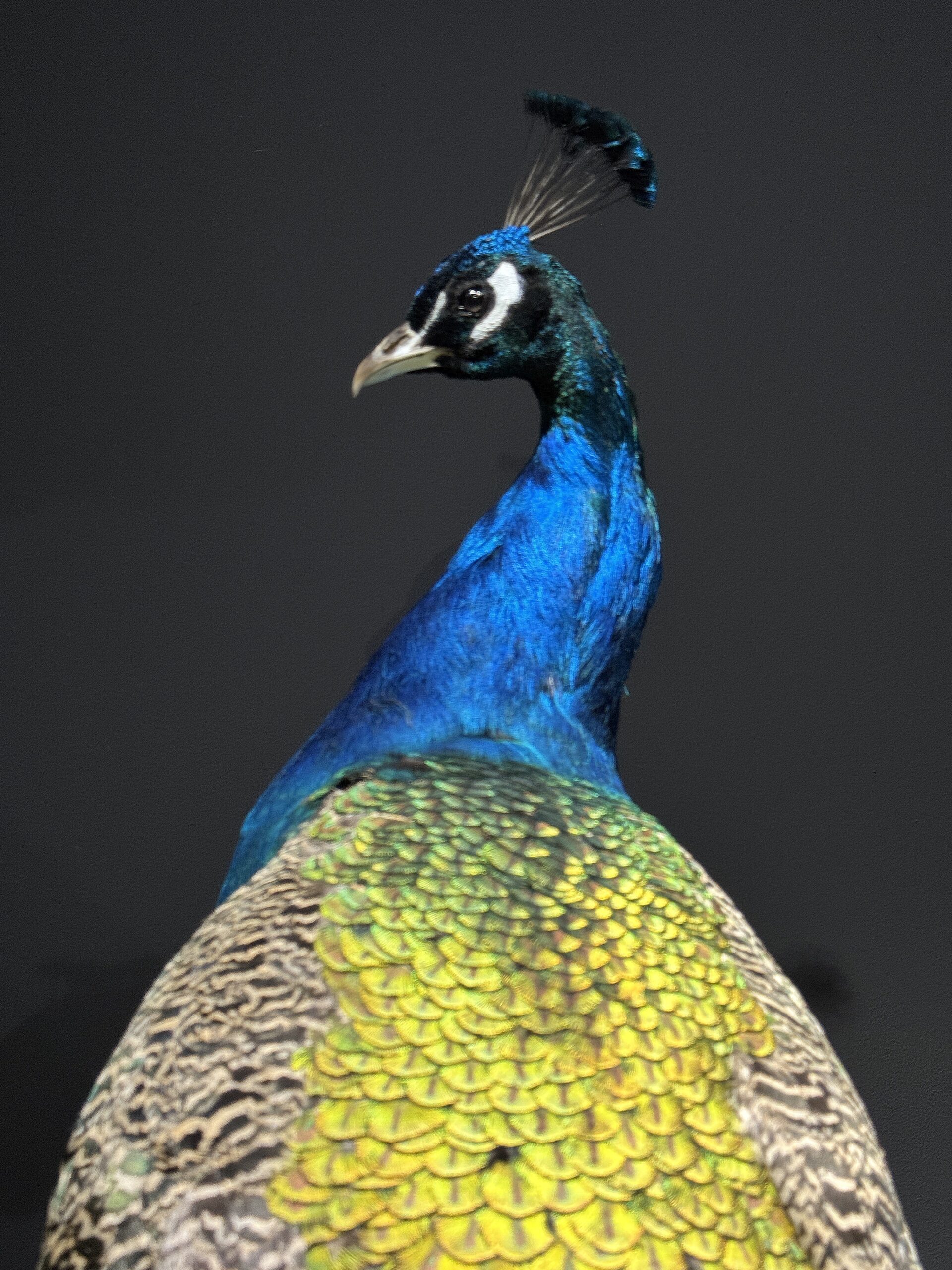 De opgezette pauw is gemonteerd op een rond houten paneel, waardoor hij makkelijk op alle ondergronden geplaatst kan worden.