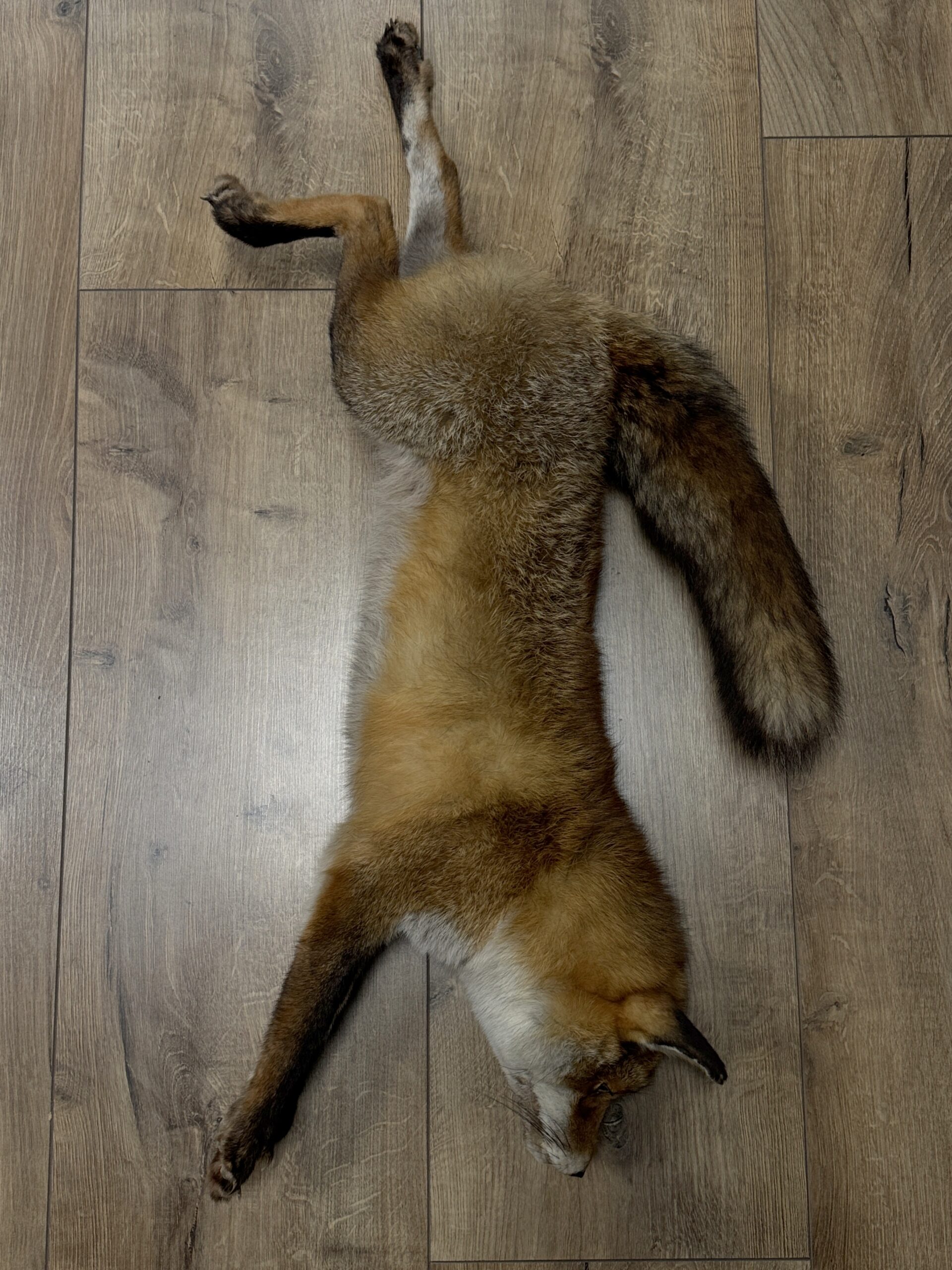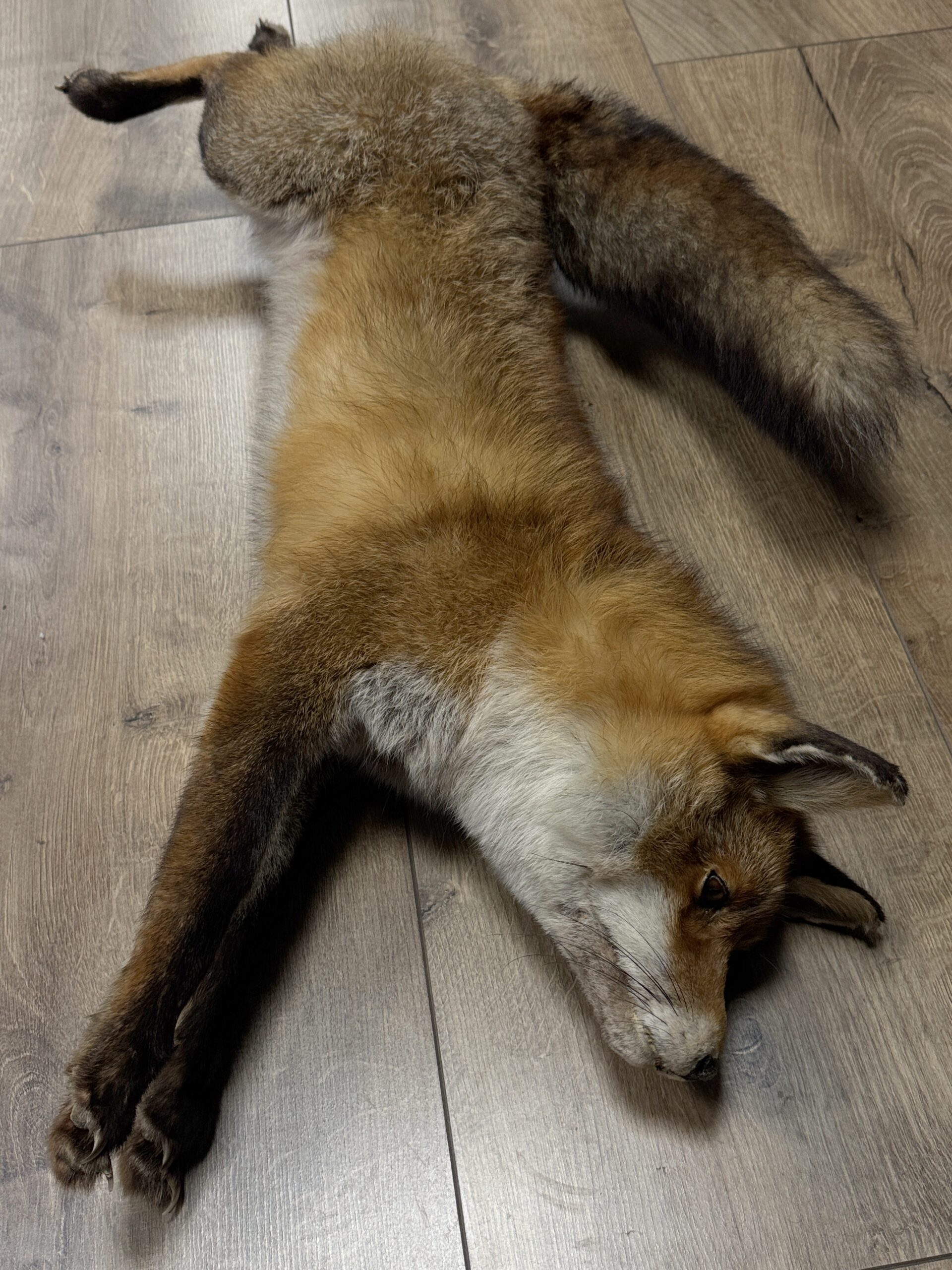 Opgezette grote vos in hangende pose. De vos is zeer natuurgetrouw opgezeten er is veel tijd besteed aan details en anatomie. Vos als stilleven.