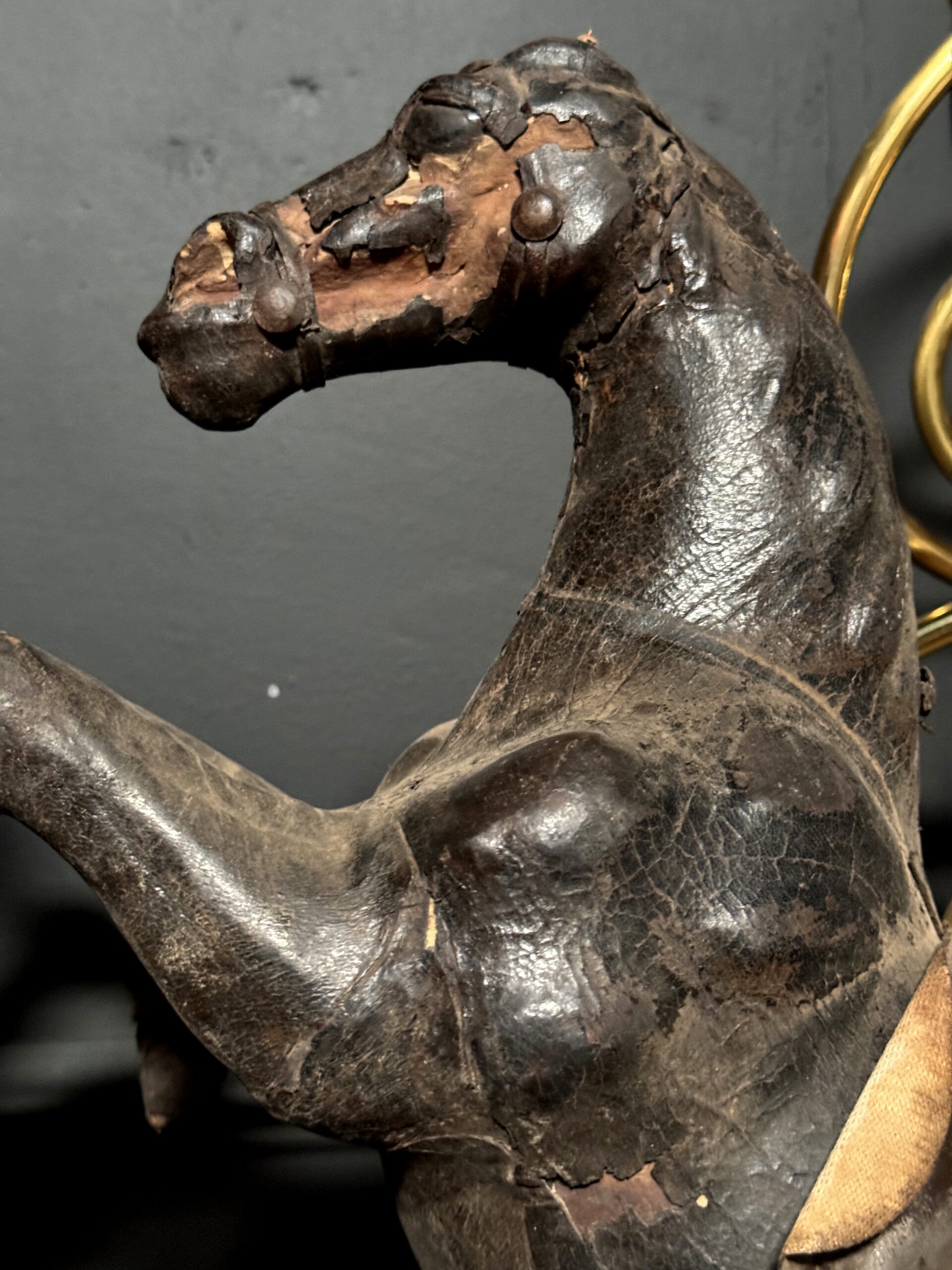 Set van twee antieke (begin 20e eeuw) lederen paardjes. Het leer is zwaar verweerd maar heeft een mooie patina. Zeer decoratieve objecten