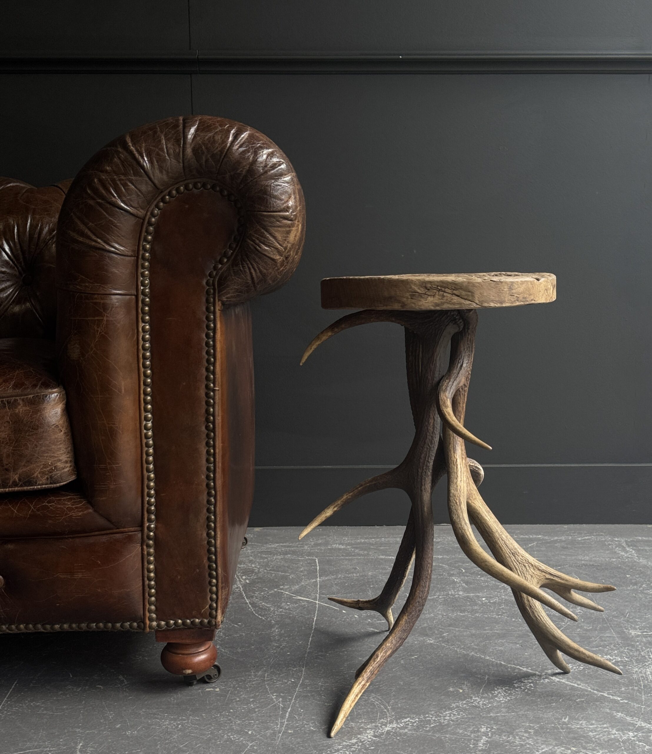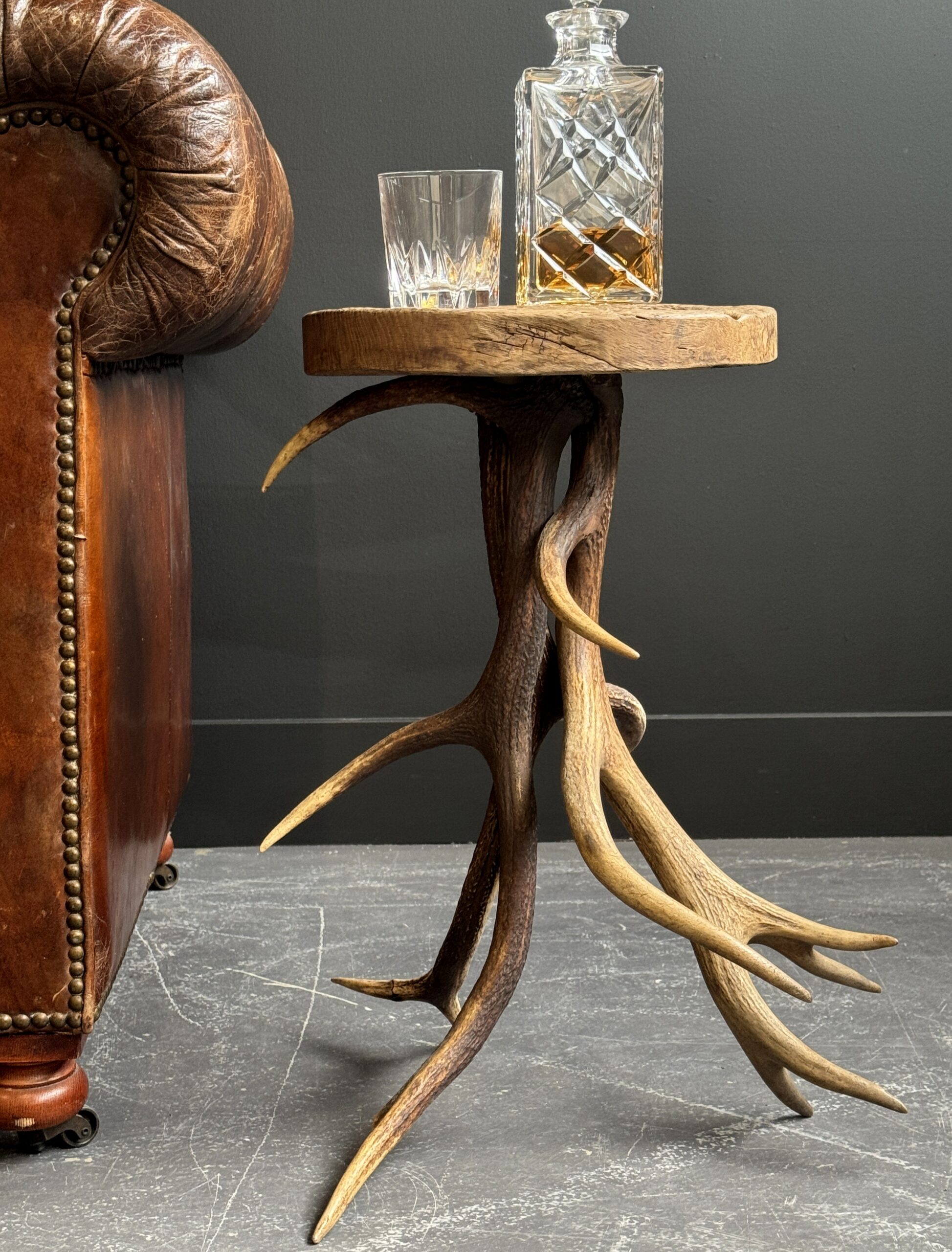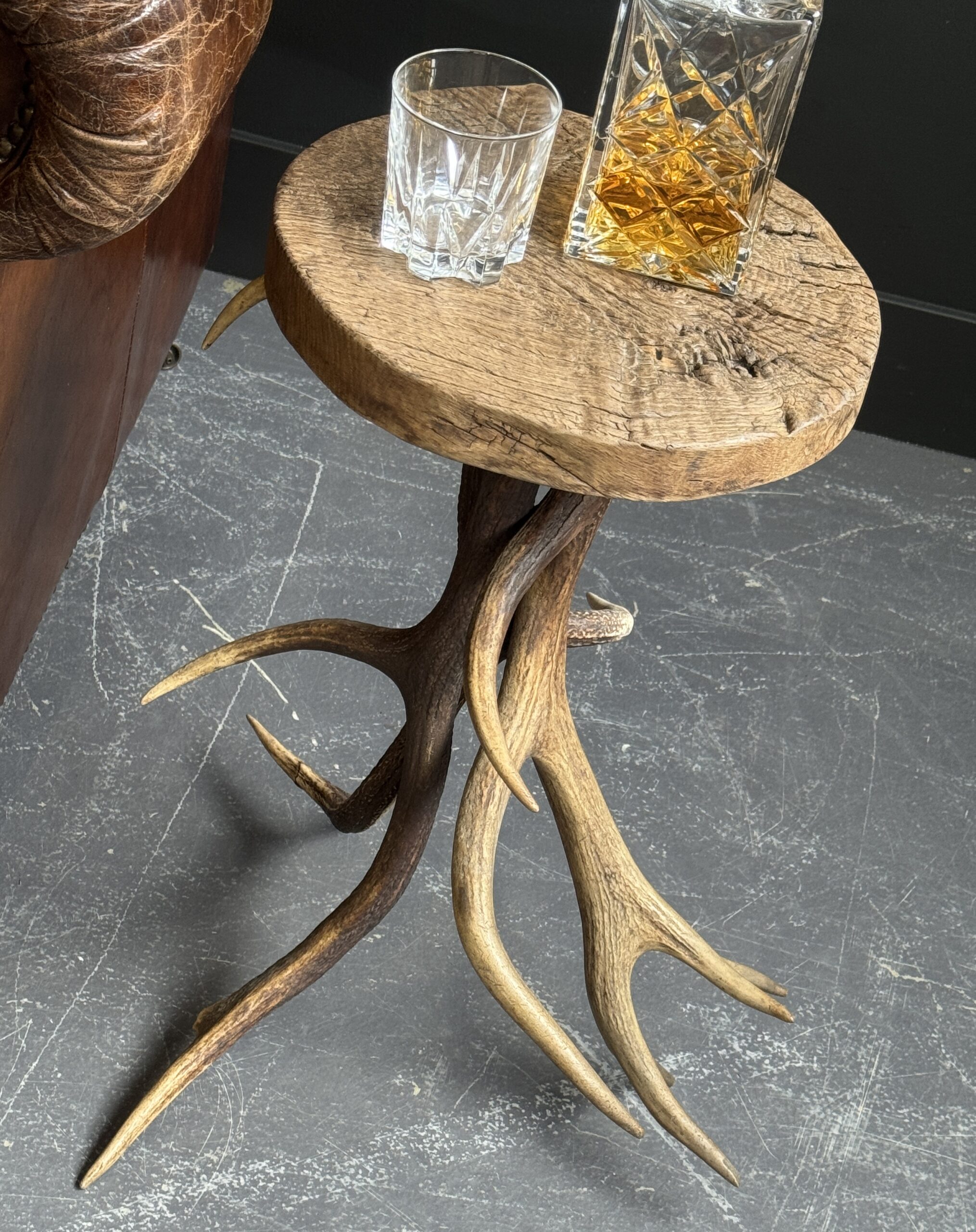 Klein tafeltje gemaakt van edelhert geweien. In combinatie met het blad van bijzonder oud eiken, geeft dit het tafeltje een stijlvolle uitstraling.