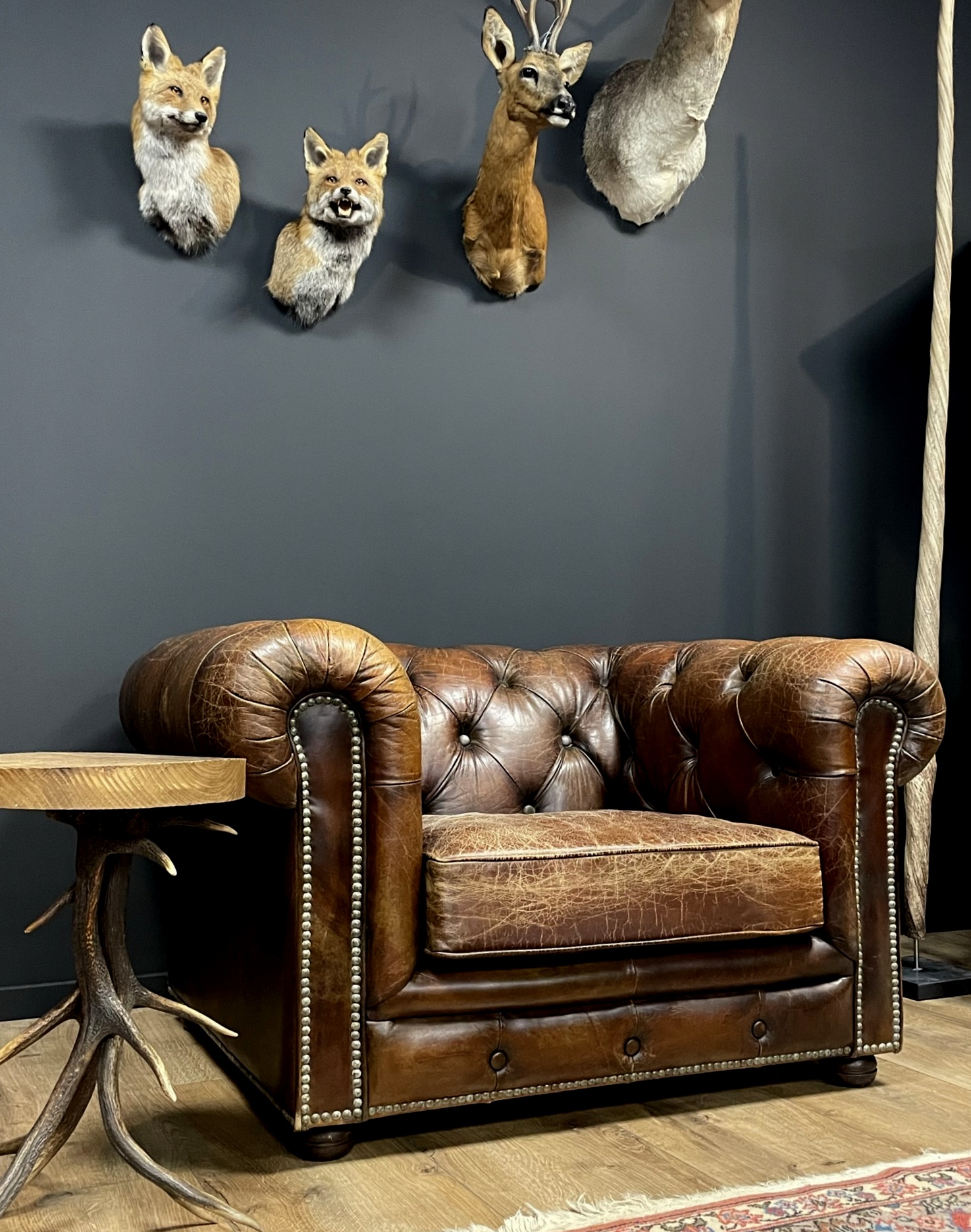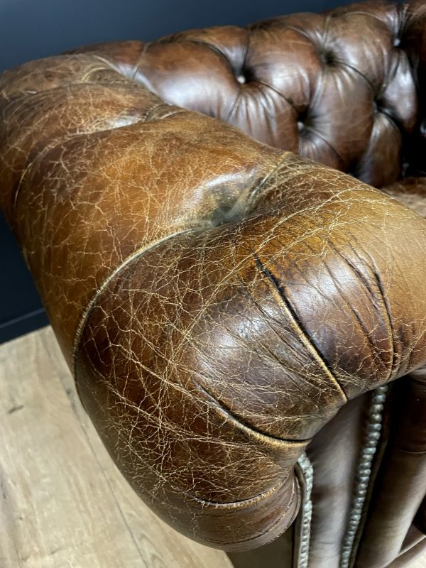 Deze bijzondere en grote bruin lederen Chesterfield fauteuil is een ware eyecatcher in uw interieur en past perfect bij de bank welke we op voorraad hebben. Door het prachtige verweerde leer heeft hij een perfecte geleefde uitstraling.